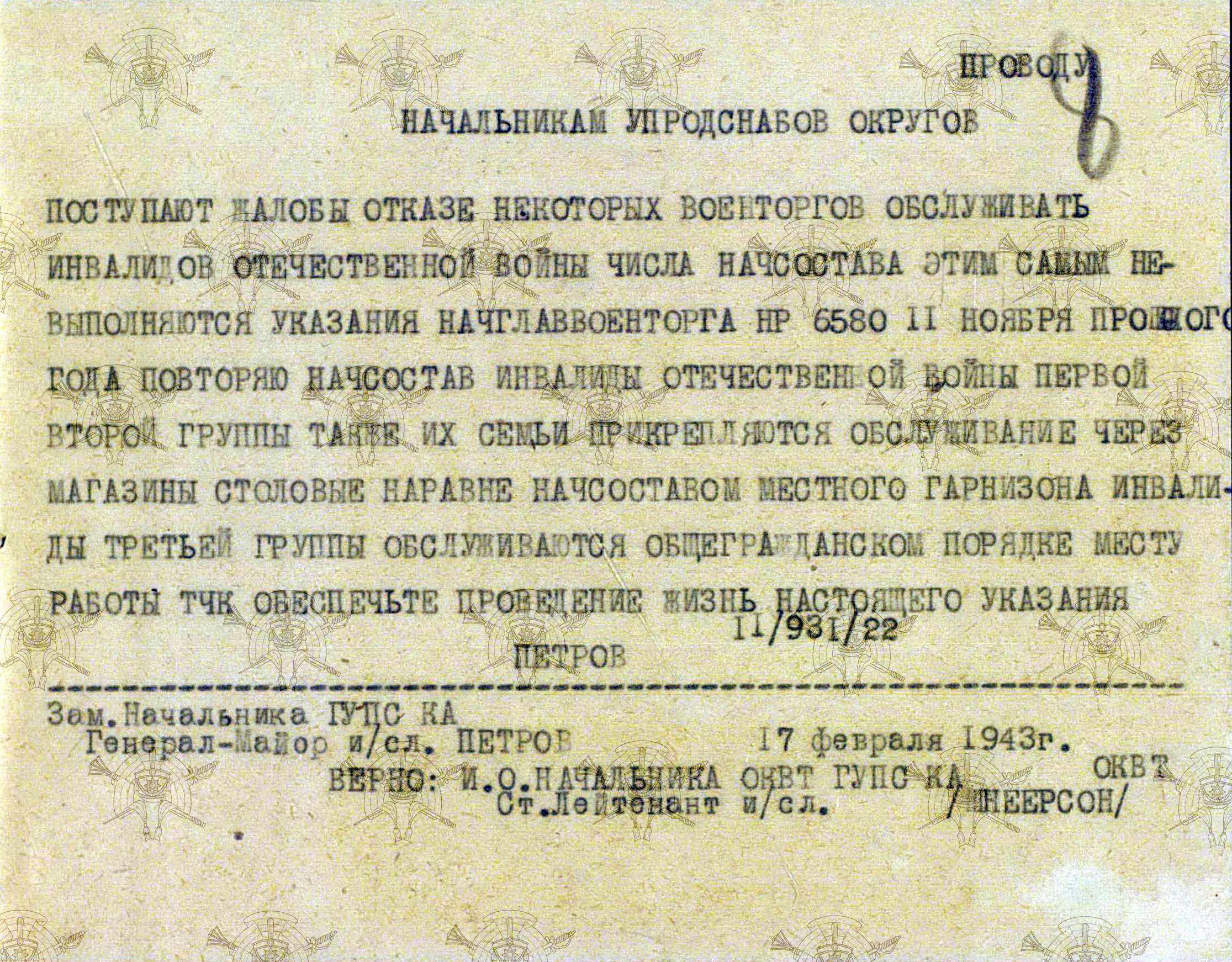 О прикреплении военнослужащих, из числа начсостава, ставших инвалидами I и II группы, а также членов их семей на обслуживание через магазины - соловые Военторга, лично я слышу впервые. Но, как оказалось, 11 ноября 1942 г. такой приказ был издан. Вот только исполнялся не всеми и не всегда: