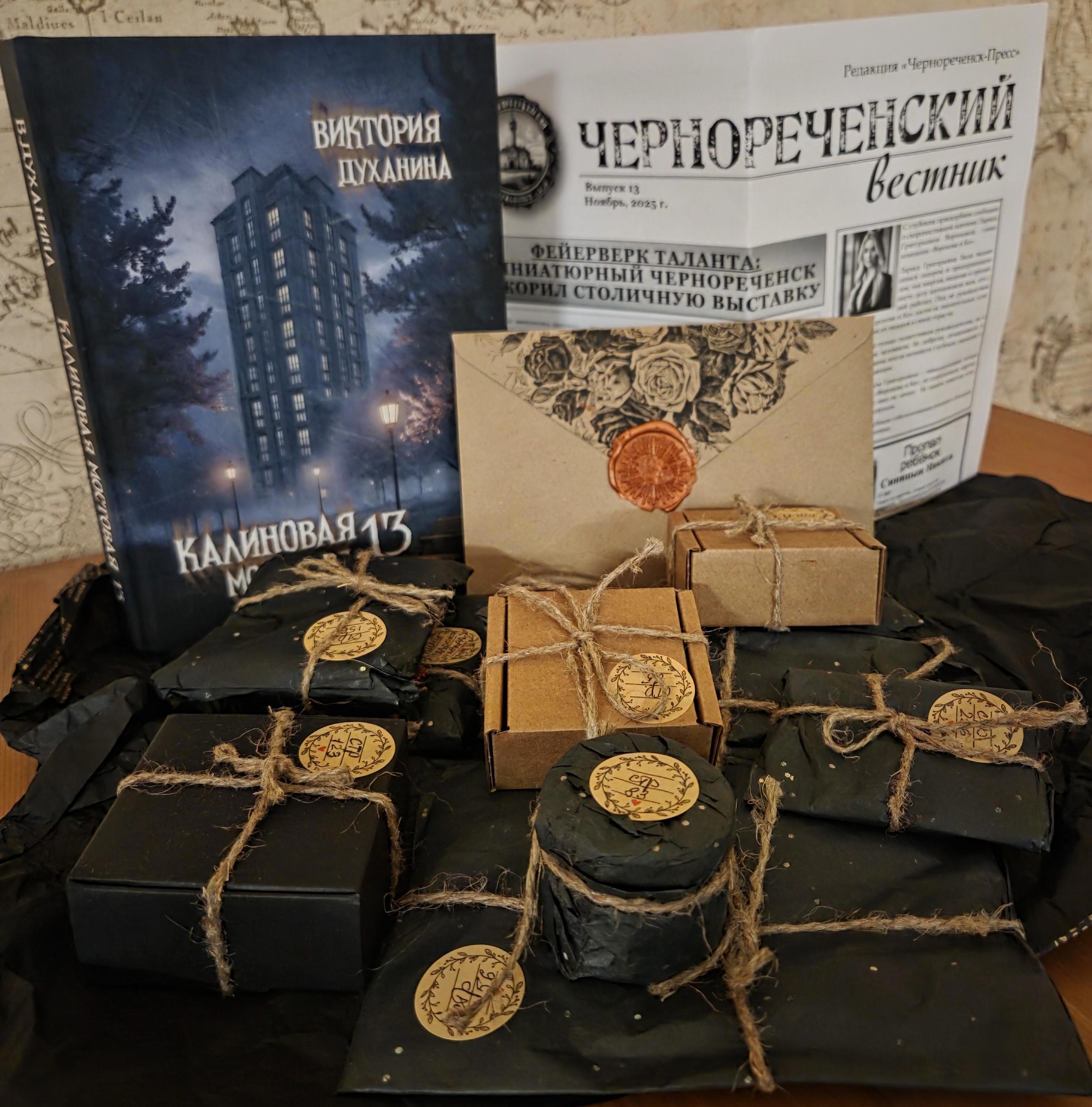 «Чернореченский вестник» - это газета с новостями, вроде бы, и каким-то образом связанная с Калиновой мостовой. Но когда начинаешь читать книгу, понимаешь, что в газете идут отсылки к рассказам, и тут будто собираешь и раскручиваешь ниточки историй. И вот то множество конвертиков и коробочек – это тоже милый подарок к каждому рассказу, с наклейкой с номером страницы, чтобы в процессе чтения открыть и удивиться предусмотрительности и заботе автора. Что внутри писать не буду, чтобы сохранить интригу, но, пошуршав одним из пакетов, я не выдержала и открыла, а там
