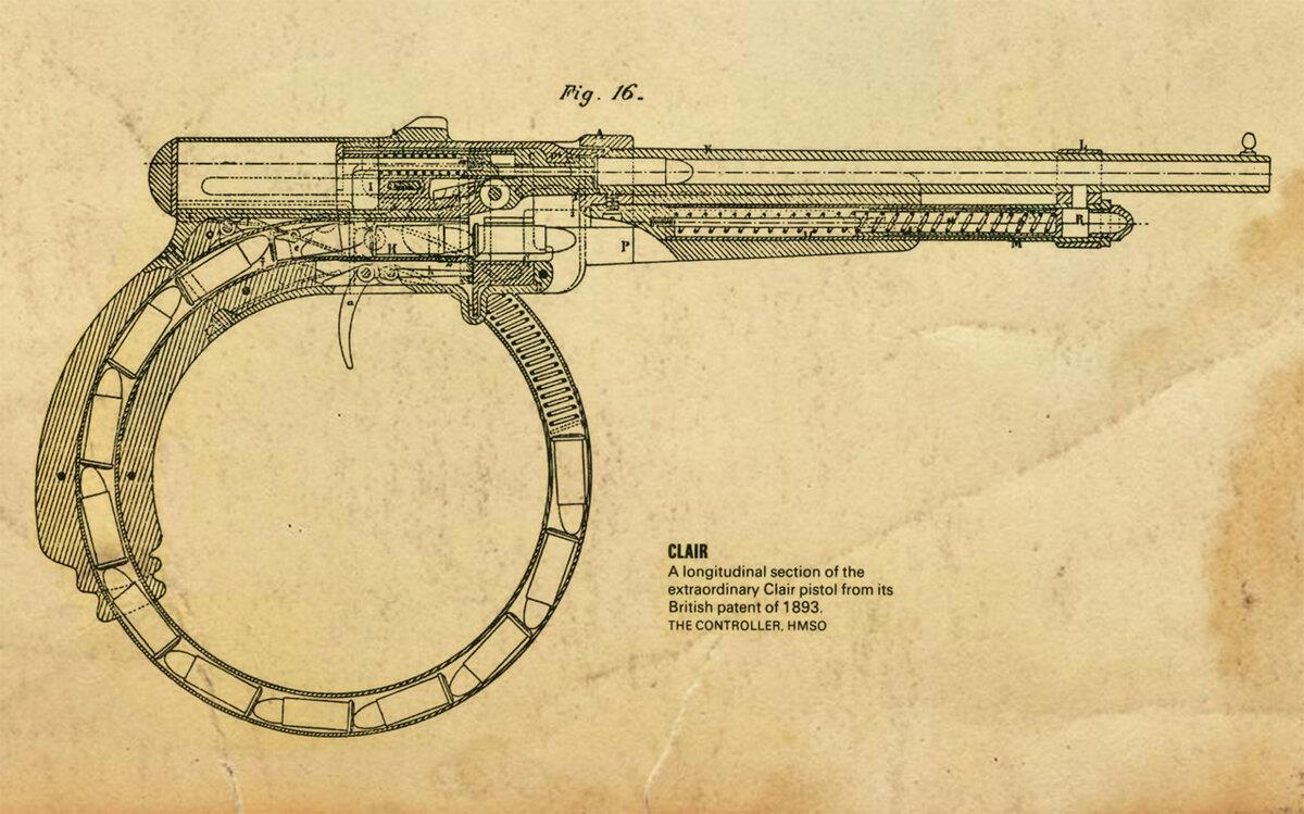 Однако ж в 1888 французские братья Клэр подали заявку на патент газового двигателя для самозарядного оружия. И на этом они не остановились, чуть позже увидели мир два творения этих французов, которые, я бы назвал одними из самых странных решений в оружейном мире. Винтовка с прикладным магазином, работоспособность которого у меня вызывает некоторые сомнения и совершенно эпического вида пистолет.