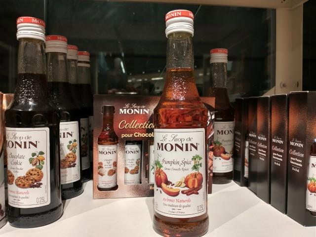 Уже второй год, как жена подсела на кофе Pumpkin Spice, то есть тыквенным с пряностями, поэтому её взгляд автоматически упирается в сиропы Pumpkin Spice, но у нас и дома они есть.