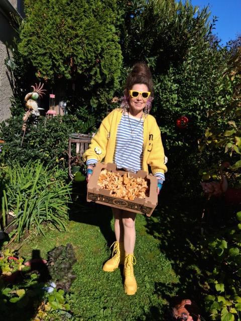 Ботинки у неё сейчас всех возможных цветов и лисички тоже жёлтые. А стоит она в нашем палисаднике.