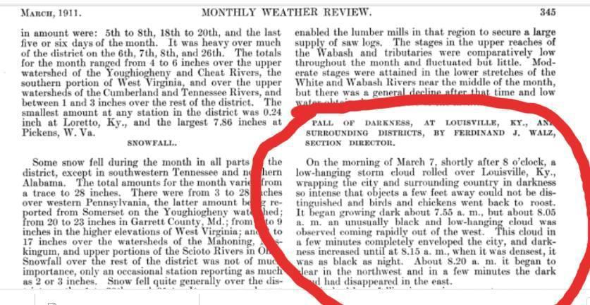 Утром 7 марта, почти сразу после 8 часов, низко висящее штормовое облако надвинулось на Луисвилль, окутав город и окружив местность темнотой так интенсивно, что объекты на расстоянии нескольких футов были неразличимы и птицы и куры вернулись на насест. Начало темнеть примерно в 7:55, но около 8:05 можно было наблюдать, как необычное черное и низко висящее облако быстро надвигалось с запада. Это облако через несколько минут полностью окутало город, и темнота нарастала до 8:15, когда она была наиболее густая, было черно, как ночью. Примерно в 8:20 начало проясняться на северо-западе, и через несколько минут темное облако исчезло на востоке».