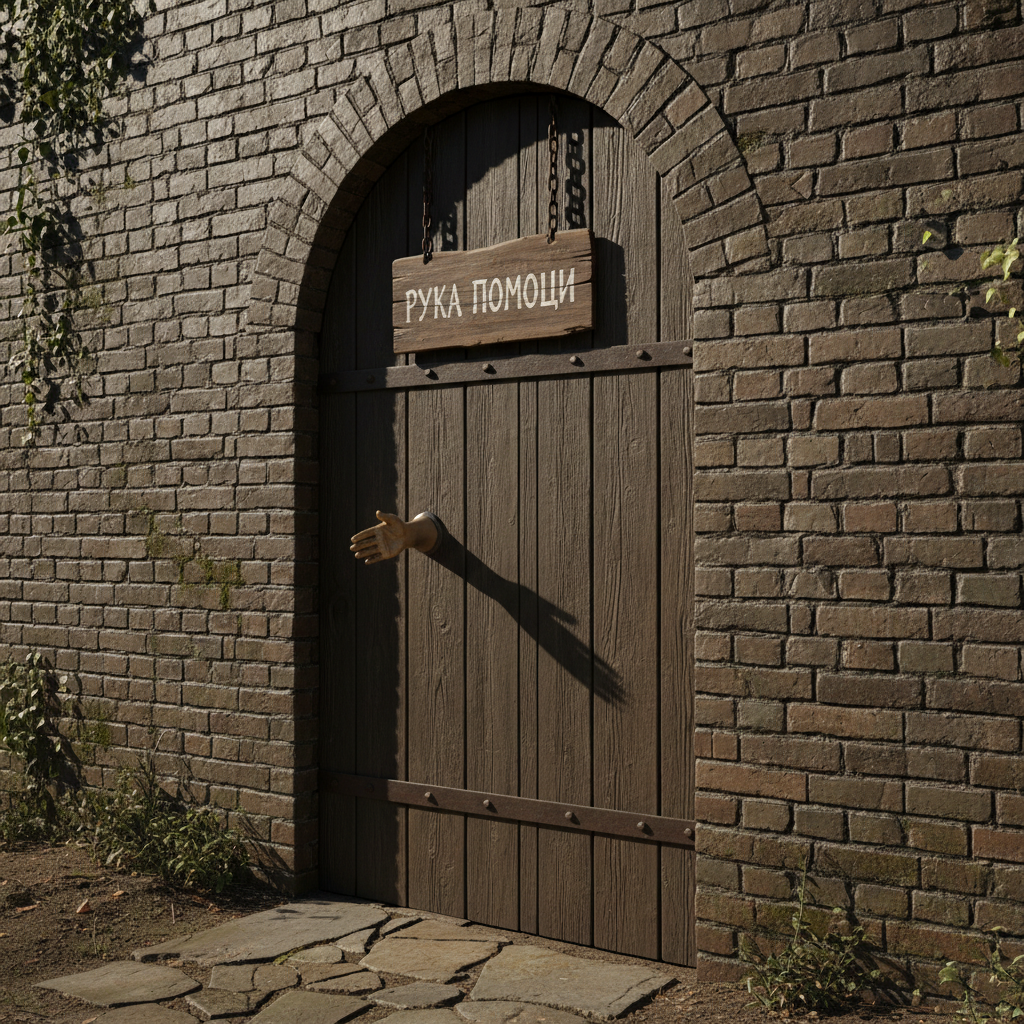 Пока что вот, дверь в бар "Рука помощи". Она, конечно, должна быть расположена в цоколе, но донести это до нейросетки у меня не вышло. Эх...