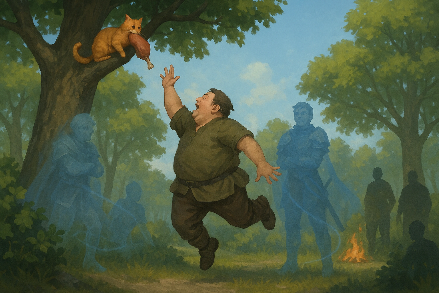 В центр лагеря, прямо перед костром, выпрыгнул Кошар. Он удерживал в зубах огромный кусок жаренного мяса. И, смотря на кусты, шипел. На кого я долго не думал, ибо вскоре через кусты выпрыгнул толстый мужчина в, мягко говоря, потрепанной одежде. Лицо было красное, и выглядел он жалко. Одного простого взгляда было достаточно, чтобы в моей голове закралась безумная мысль – где-то я его уже видел. Но не мог вспомнить, где именно.