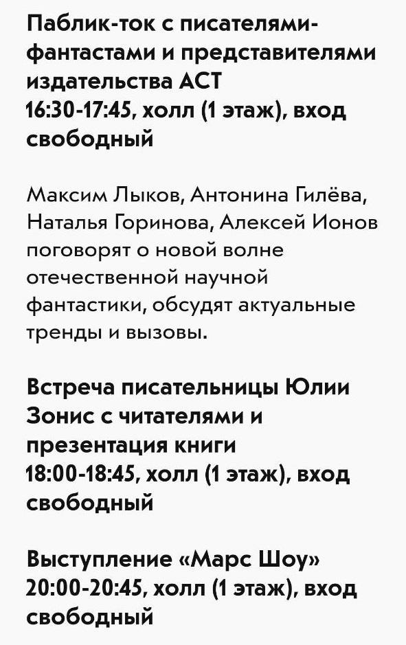 Автор: Зонис Юлия Александровна9 ноября в Москве на ВДНХ, павильон Атом, подробности тут Начиная с пленарки про Роулинг и Хокинга и до презентации "Атланта и Демиурга" в холле, велкам