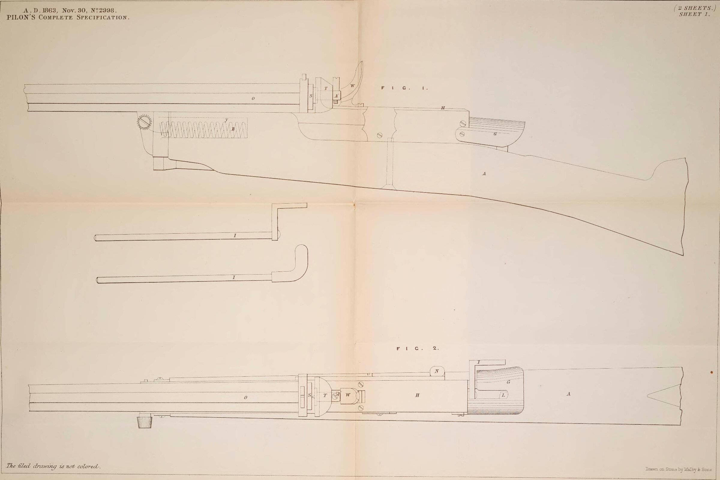 В патенте 1863 года Пилон пишет: усовершенствованное огнестрельное оружие оснащеное средством уменьшения отдачи, спусковым крючком, приводимым в движение большим пальцем, и имеет подвижную или неподвижную казенную часть.