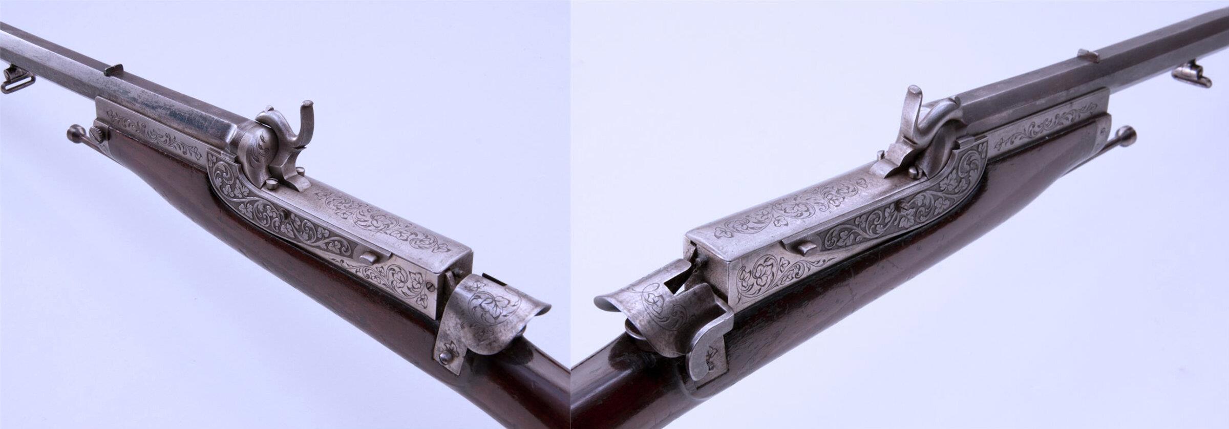 И действительно предлагает два варианта оружия - в первом случае это капсюльная винтовка с автоматически открывающимся затвором, взводящимся курком и своеобразным буфером отдачи, во втором - оружие под шпилечный патрон Лефоше.