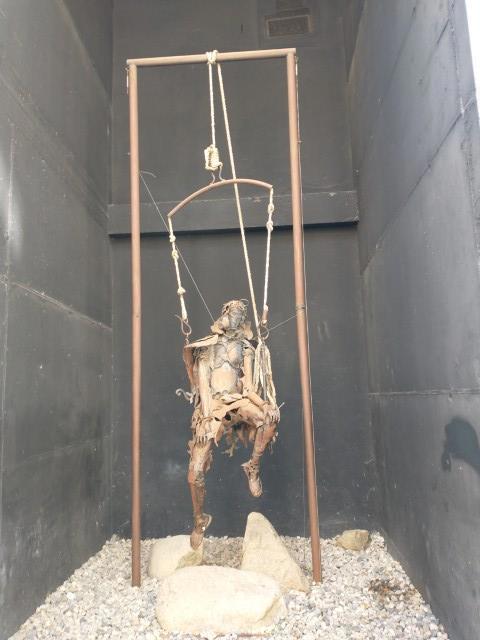 Ржавая металлическая скульптура мужчины на качелях возле Нового парламента Андорры