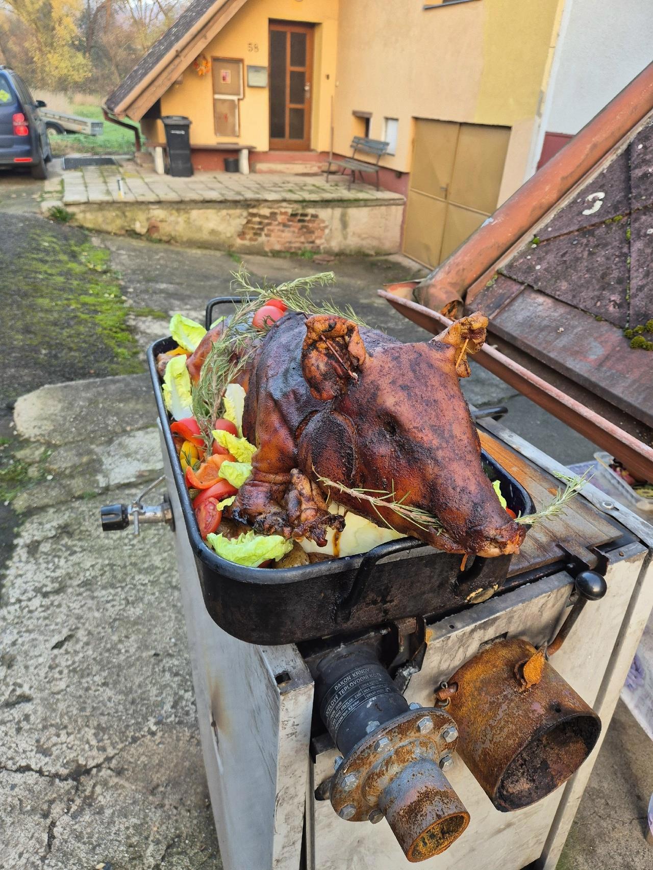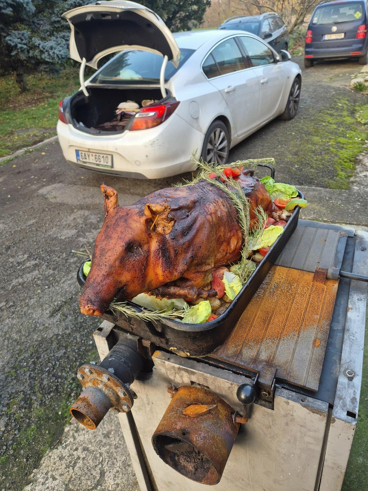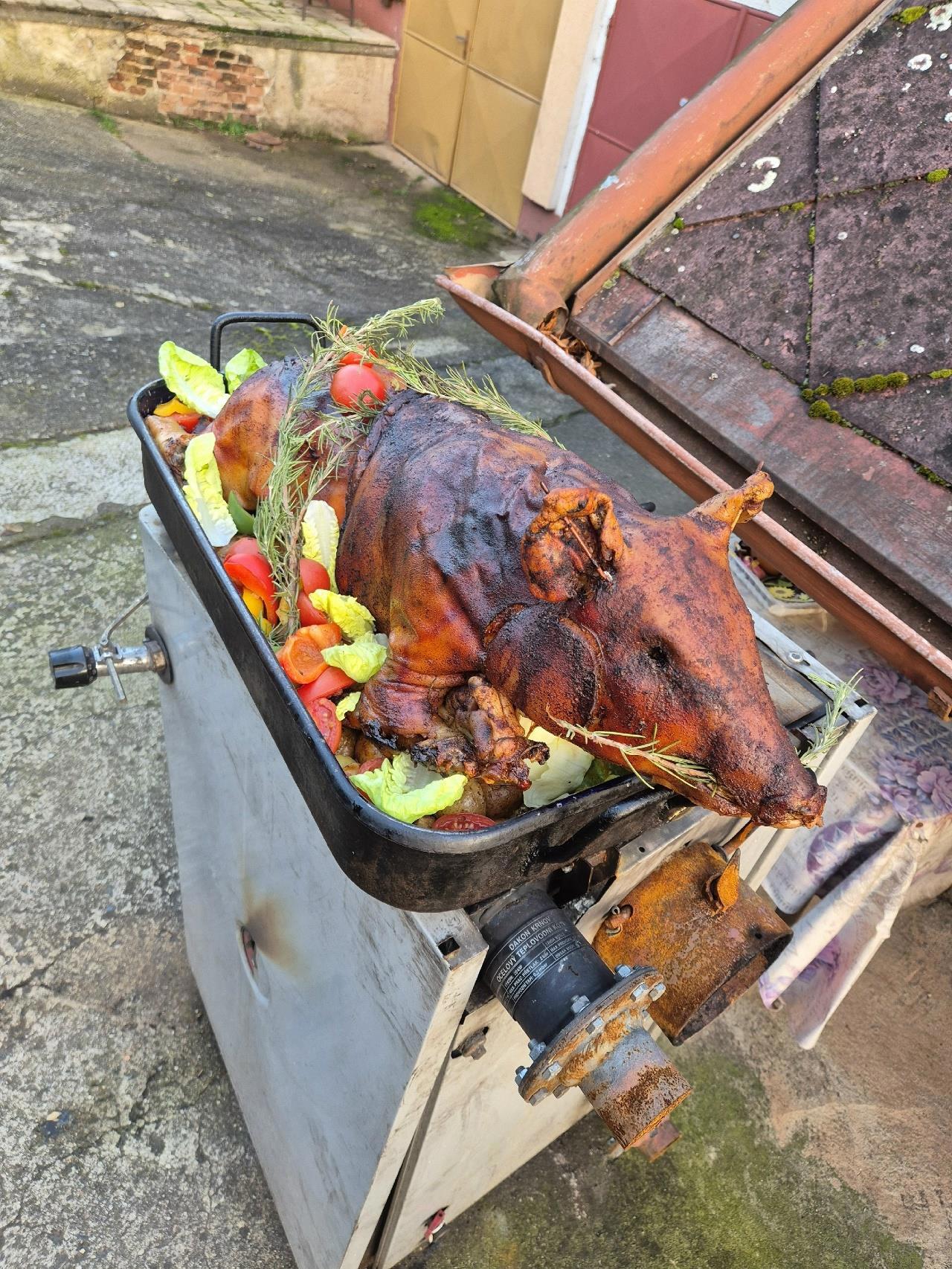 Порося приехало! Для фоток поставили поднос на старый угольный бойлер соседки. там взади виден наш домик охряной