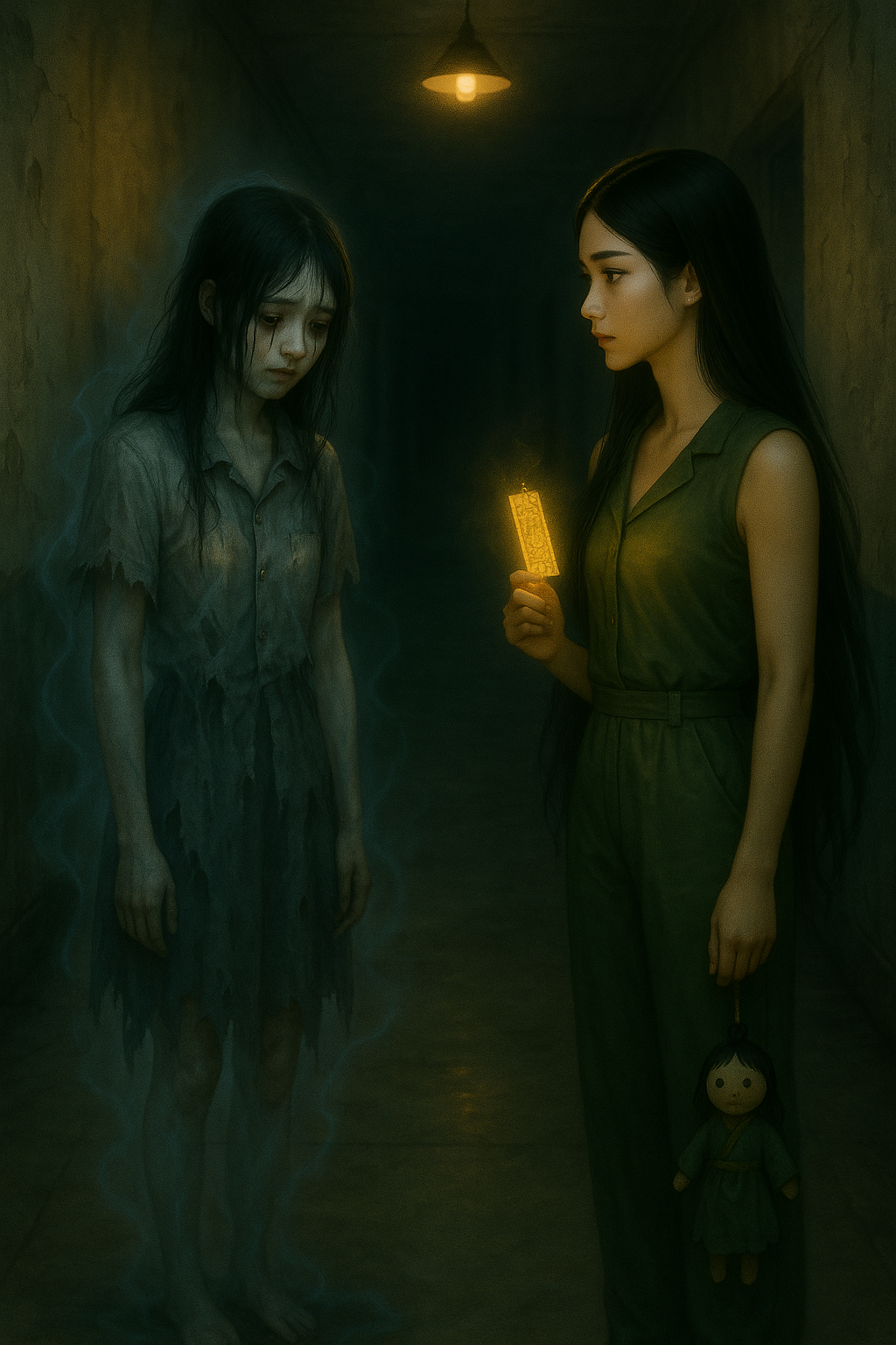 Обиженный дух Сунь Минсяо обитал на шестом этаже старого корпуса. Мэн Цзыи шла последней, её шаги отдавались в пустом коридоре. Но стоило ей ступить на площадку шестого этажа, как фигуры её товарищей впереди внезапно исчезли, будто растворились во тьме.