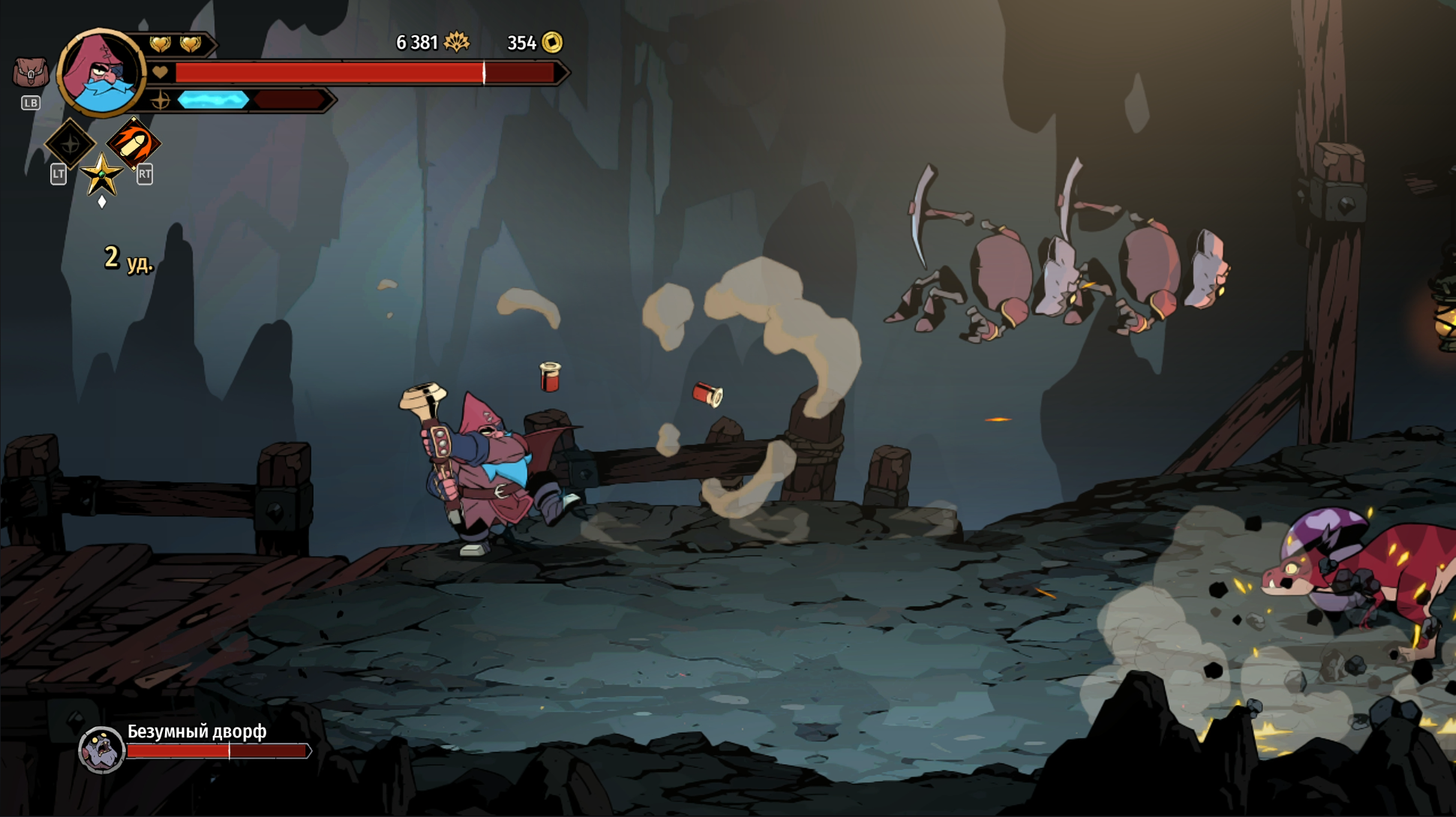 По демке (а я и в неё поиграл) казалось, что рогалик к игре пришит абы как. Вместо олимпийских богов в Absolum связанные ритуалы – что-то вроде магических школ. И в демке у нас были ритуалы огня, воды, ветра и электричества – вообще скука. Ну да, подбрасывают игроку иногда эти апгрейды – чтобы атака огнём била или фиолетовыми искрами. Что при этом в геймплее меняется? Да… ничего. Но вот финальный список ритуалов – он уже интереснее. Спойлерить я его, конечно же, не буду, но намекну, что тут целый остров некромантов есть, вообще-то. В итоге, кое-какие билды можно уже через эти ритуалы выстроить – поиграть через призыв, через метательное оружие. Второй столп местного билдостроя – это вот те самые «молотки». Есть у нас, например, Карл – гном, чуть более прочих героев склонный к использованию бросков и захватов. Парой апгрейдов можно сделать из него полноценного борцуху (и усилить броски ритуалами воды или воздуха). А можно… вообще на ближний бой забить и сделать Карла стрелком – вон же, у него и ружьё есть.