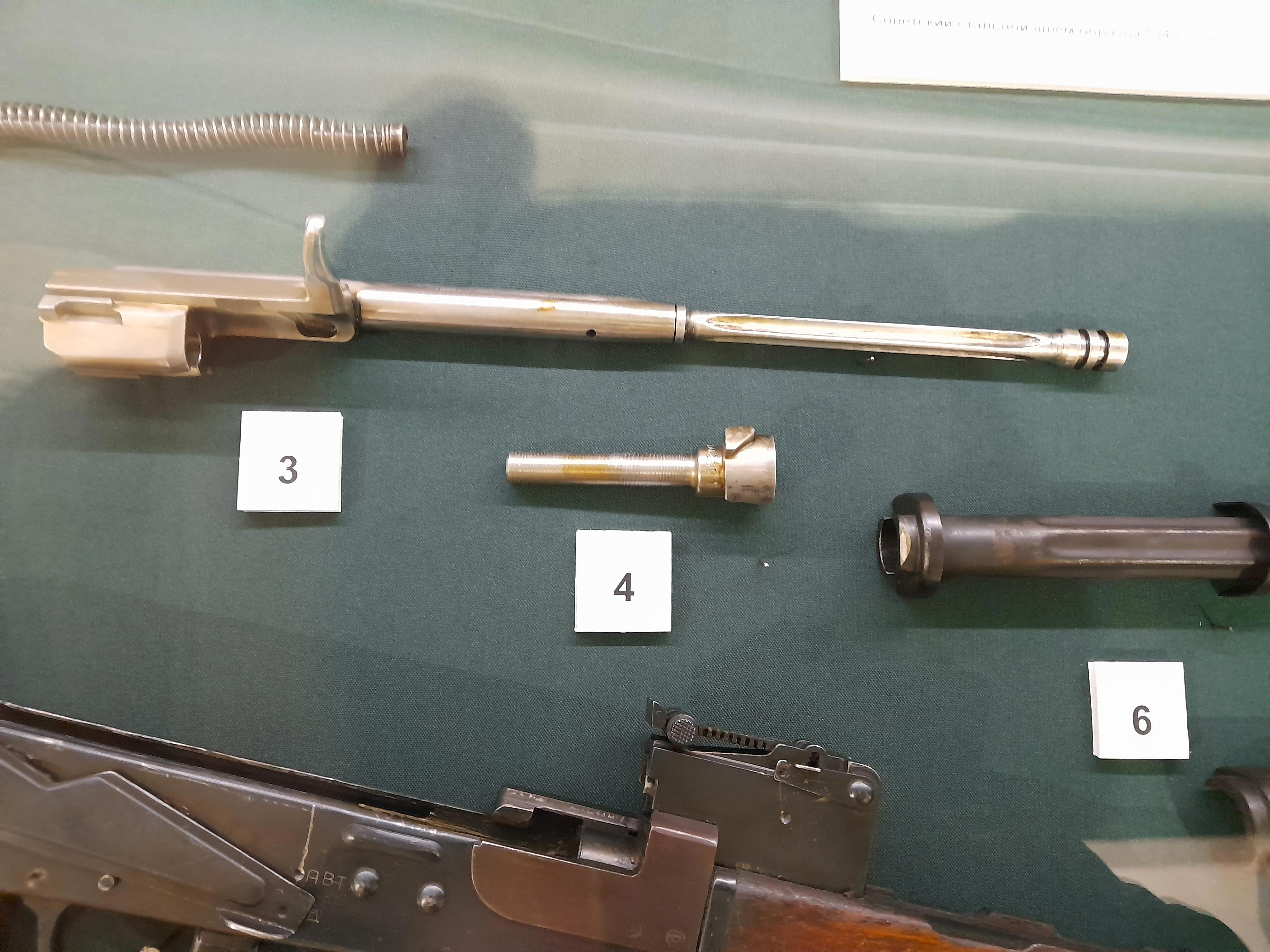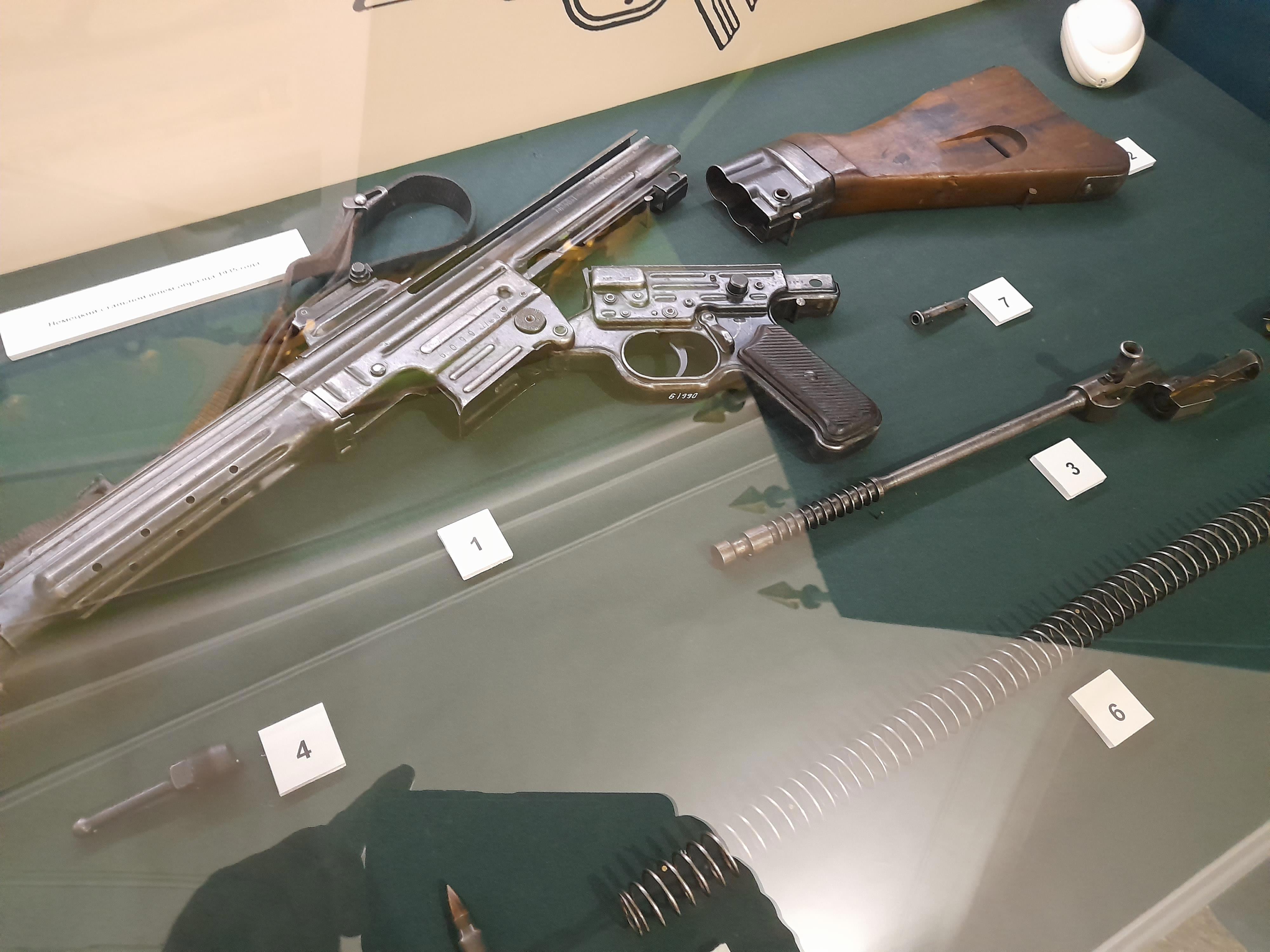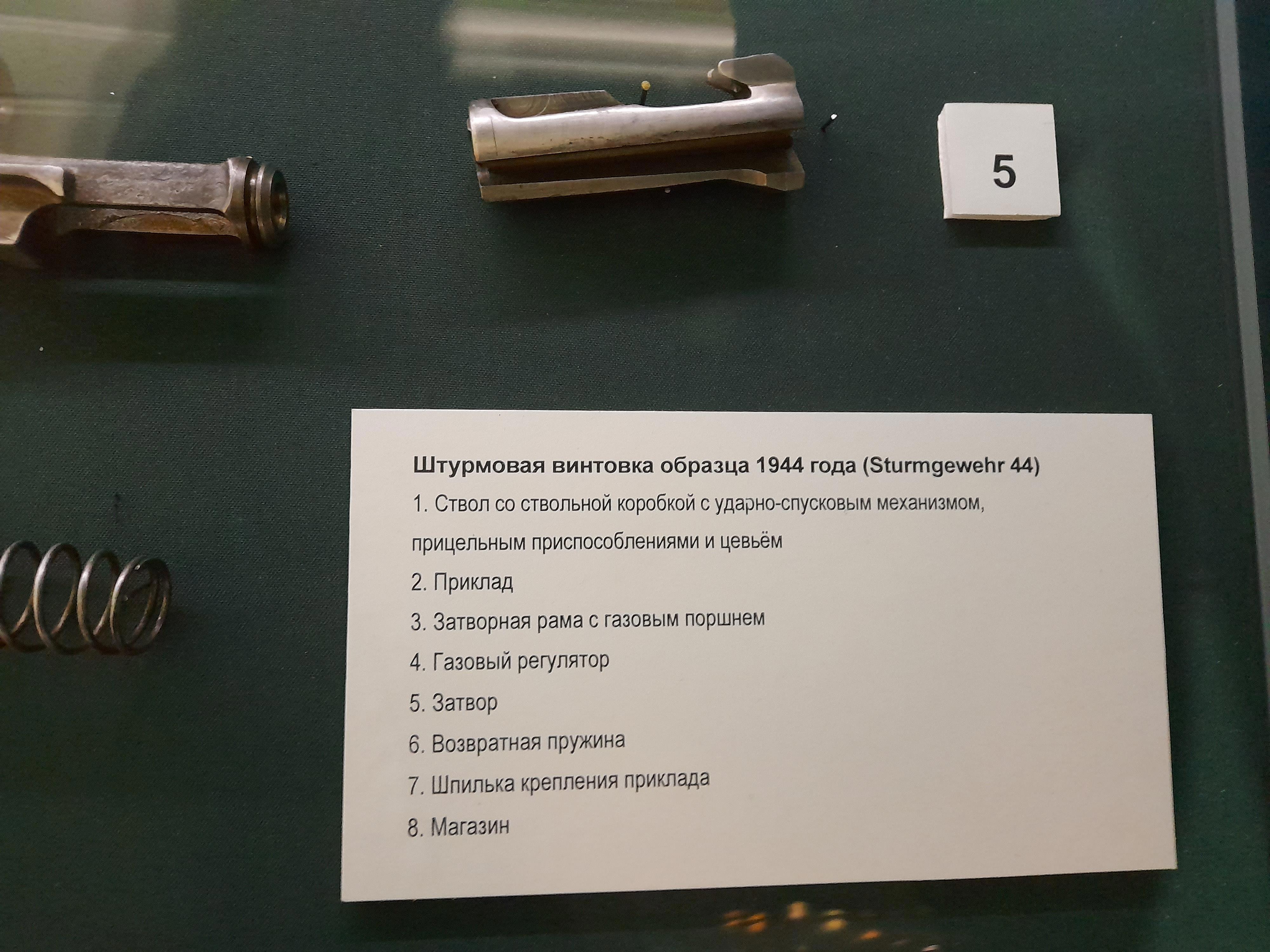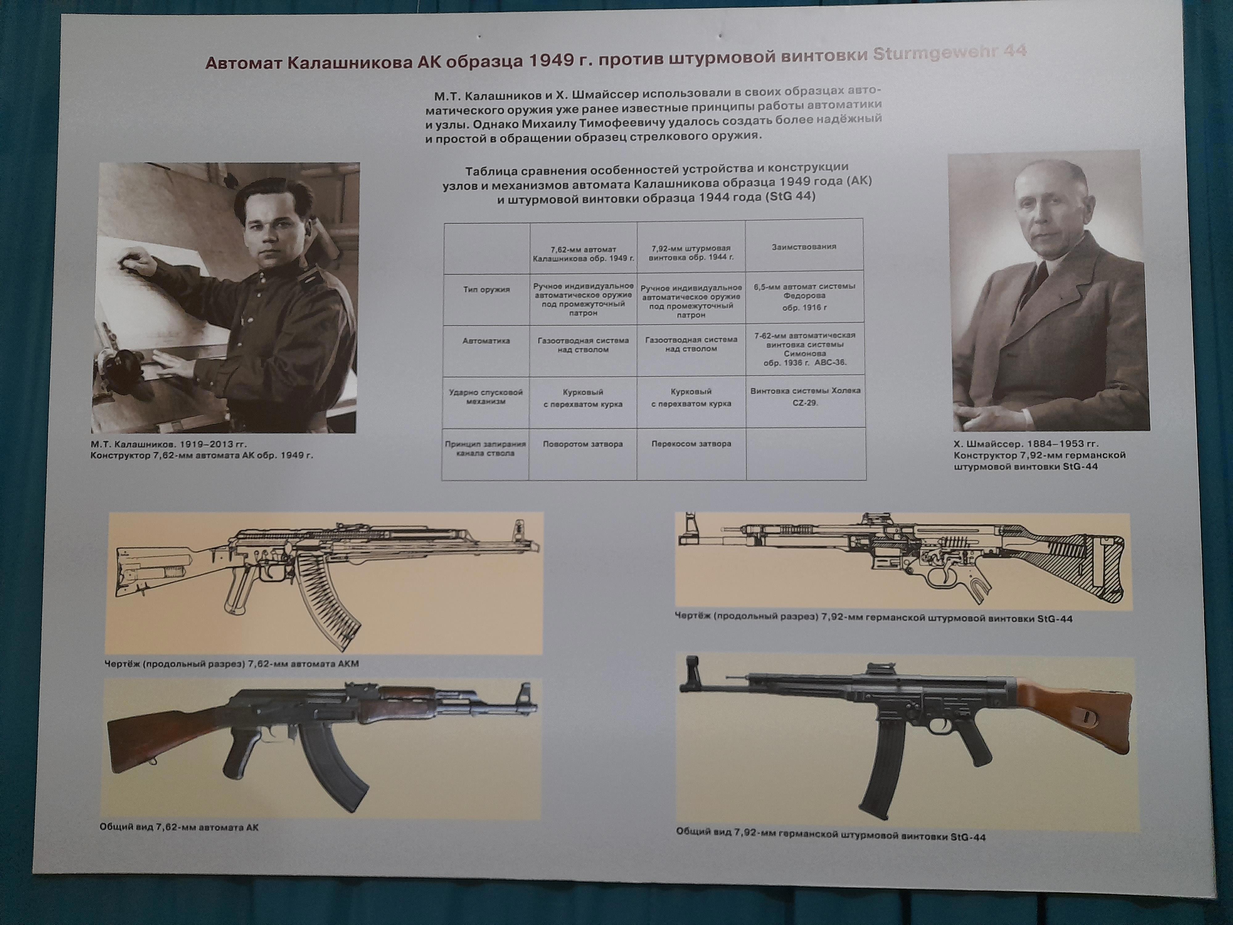 Видать их совсем достали - поставили стенд с разобранными АК и Штурмгевером 44. И разница наглядна даже для женщин, которые не шибко любят оружие.