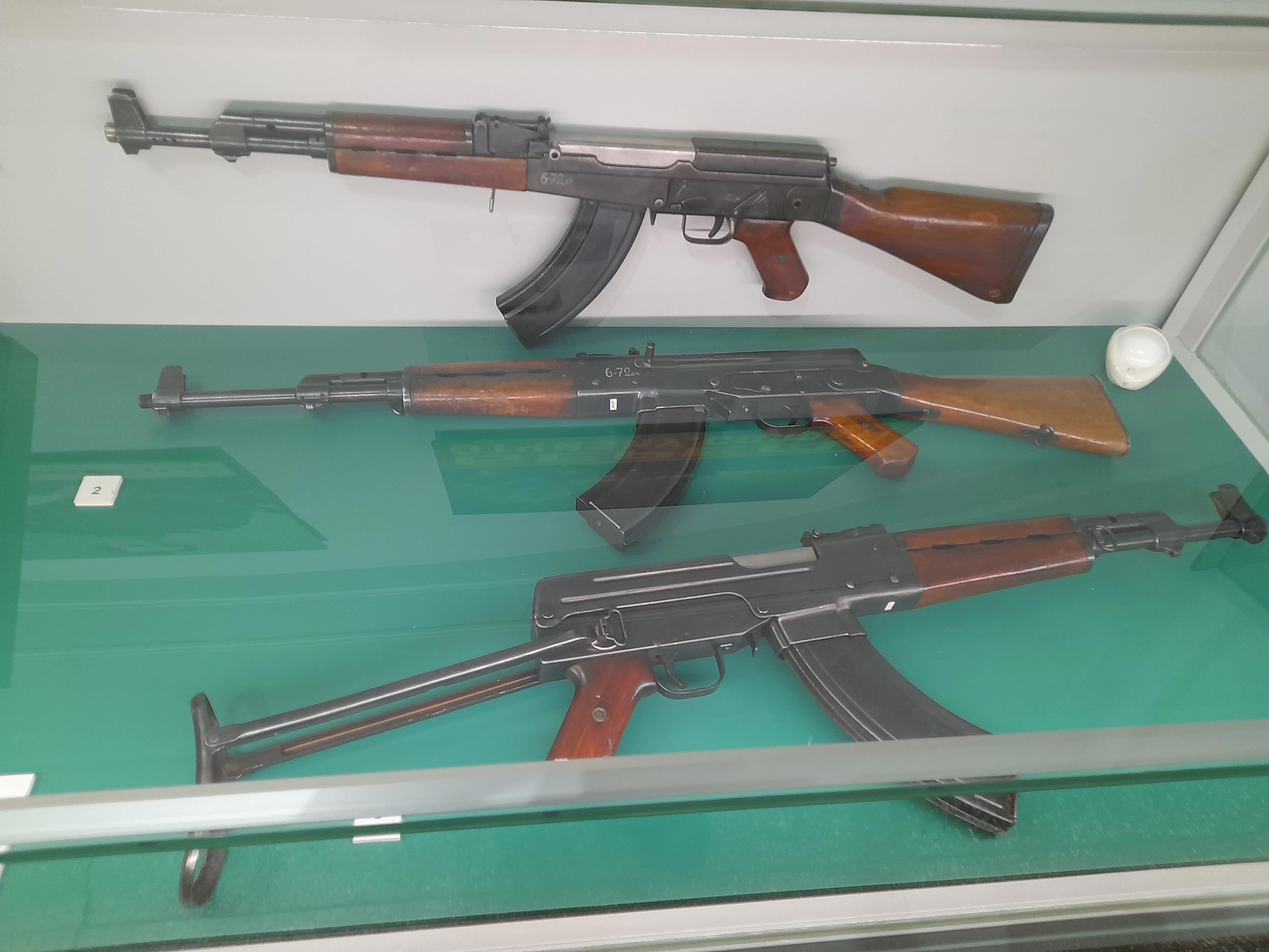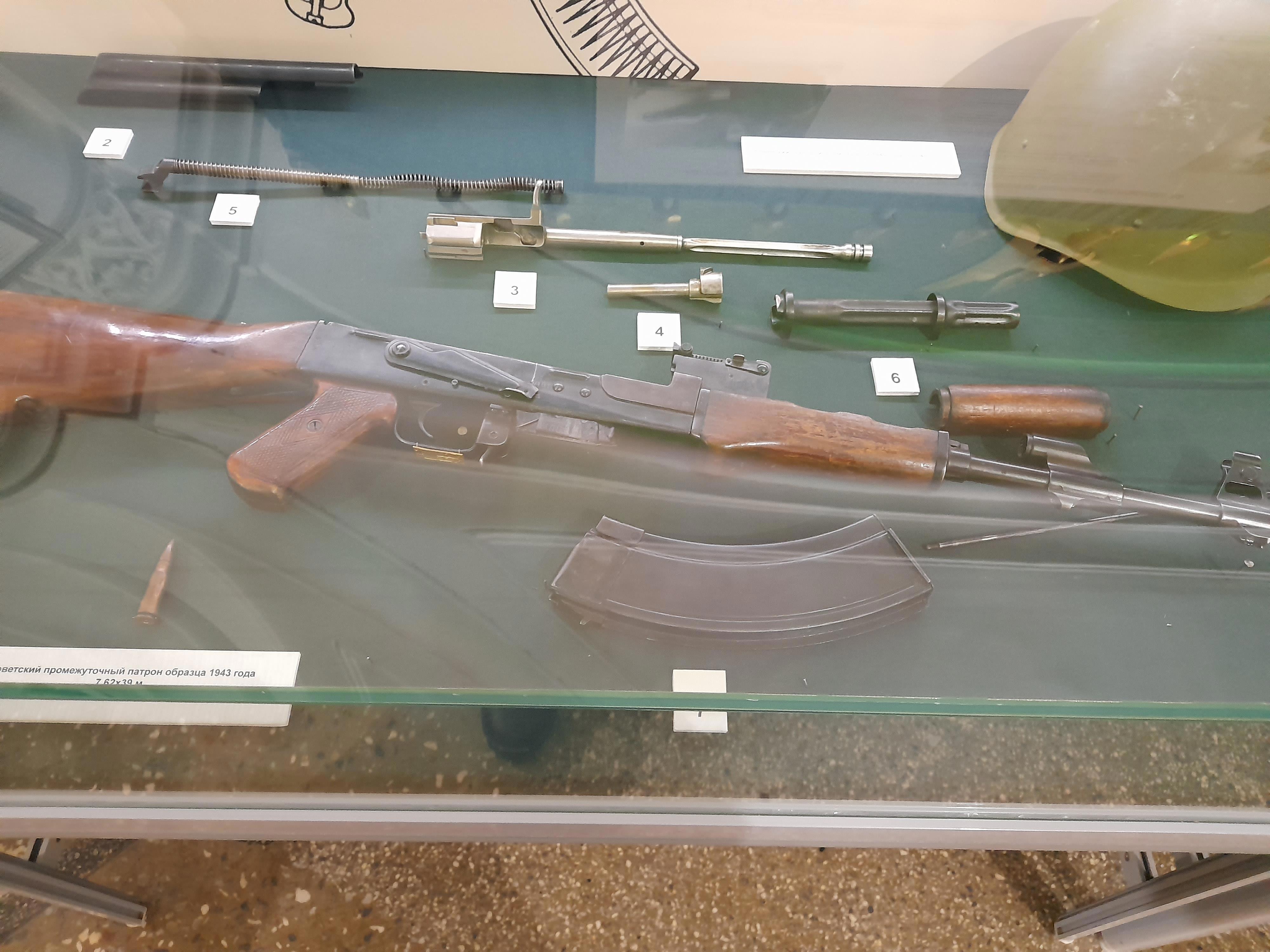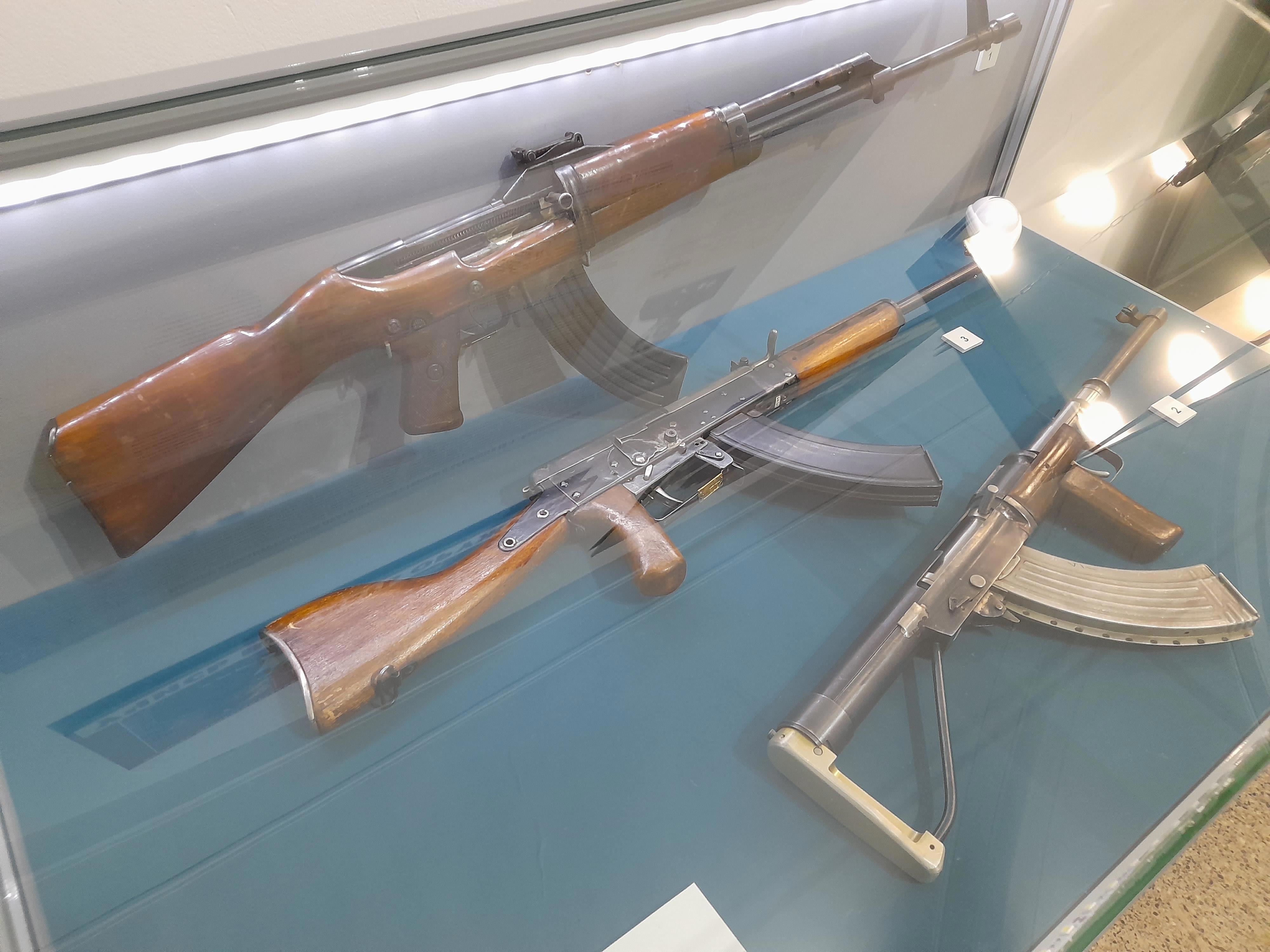 Видать их совсем достали - поставили стенд с разобранными АК и Штурмгевером 44. И разница наглядна даже для женщин, которые не шибко любят оружие.