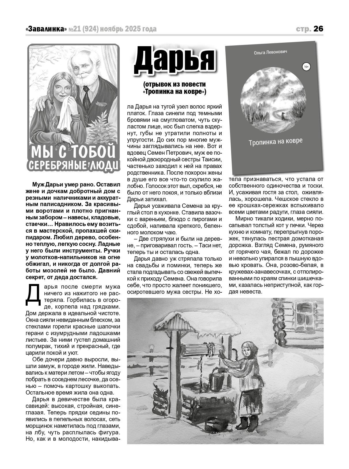 Автор: Ольга ЛевоновичОчередная публикация в любимой мною народной газете "Завалинка". "Дарья" — глава из книги "Тропинка на ковре". Текст подредактировали, и мне это понравилось, получился вполне законченный рассказ. Саму книгу надо, конечно, издать нормальным тиражом, а то от первого у меня осталась одна книжечка. Сначала думаю ещё поработать над текстом, кое-какие иллюстрации заменить. То есть литературный, творческий процесс идёт, жизнь продолжается.