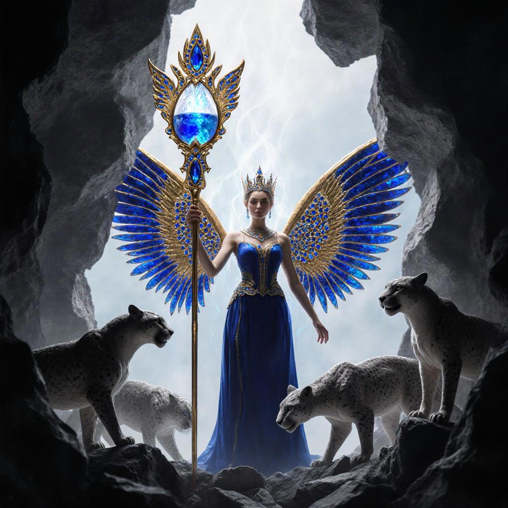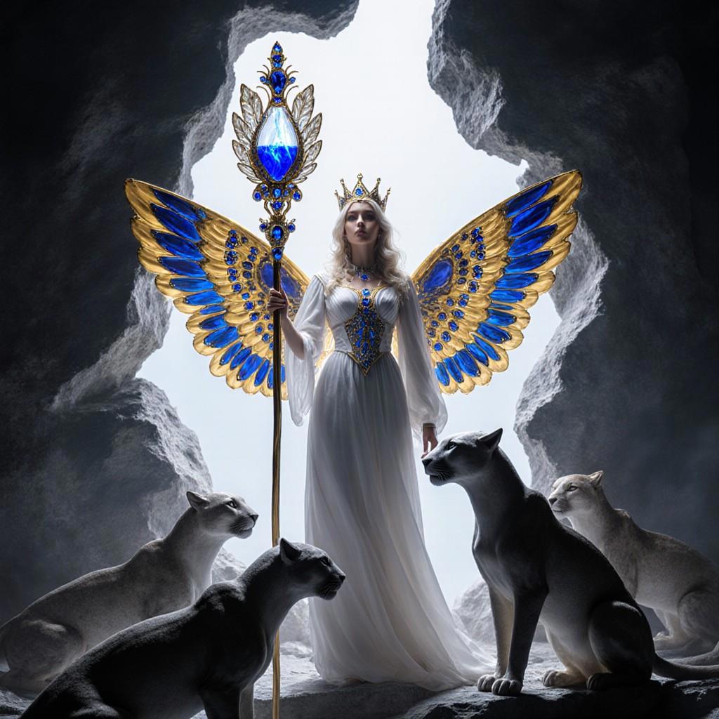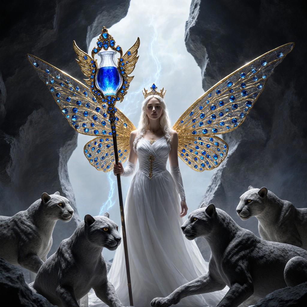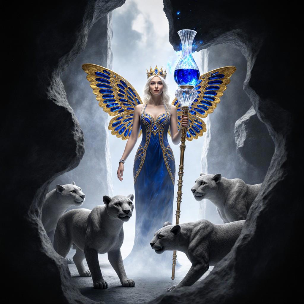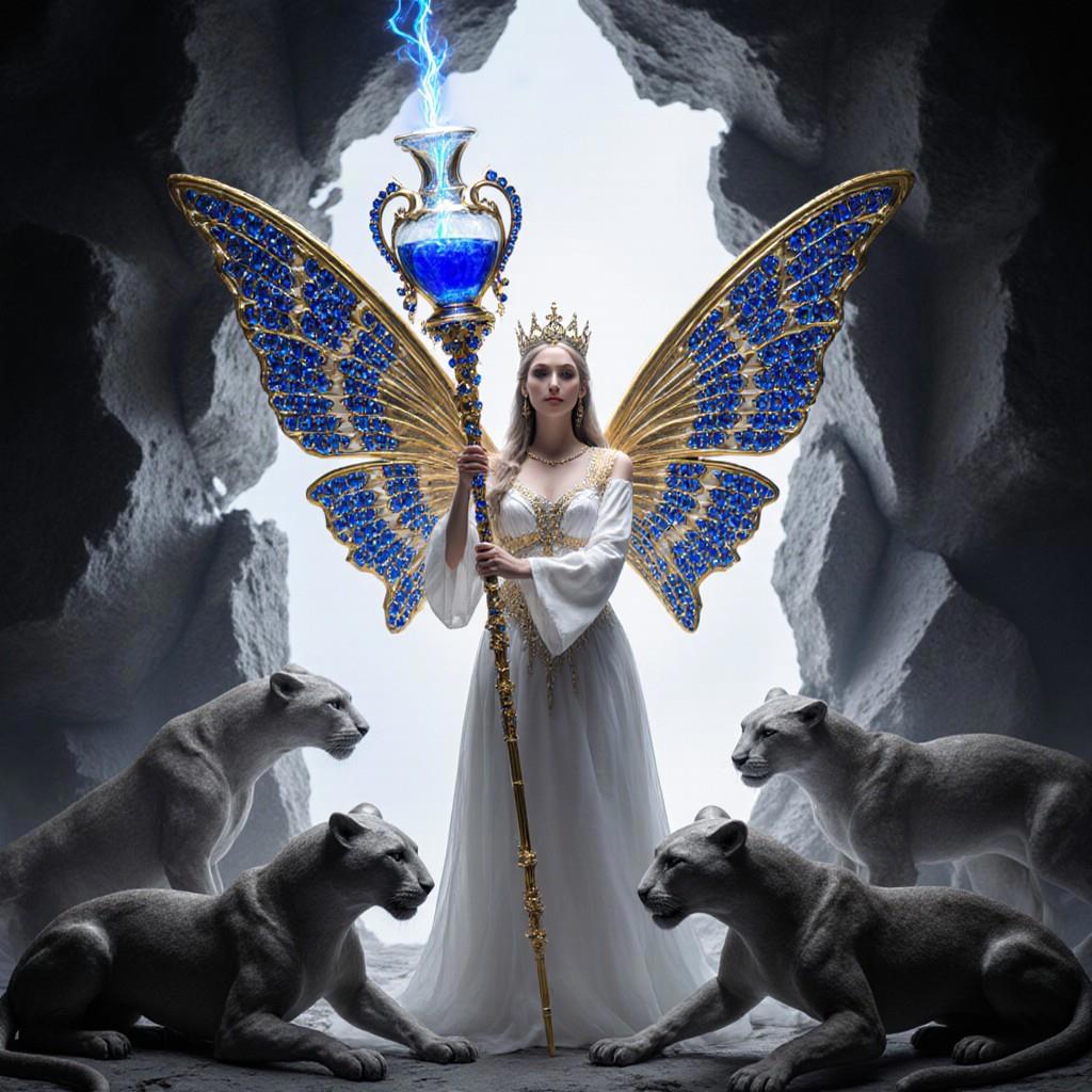"И тут с эстрады грянула музыка, а тот же голос торжественно произнёс, так как сквозь рябь портала показалась женская фигура, с золотым, и украшенным сапфирами, жезлом в руке, заканчивавшегося на верхушке сосудом из резного хрусталя. При этом жезл, с двух сторон, украшали золотые крылья. В форме крыльев бабочки, но как будто составленных из перьев, с эмалью в цвет сапфира. И обрамлённых золотой окантовкой. И это было не только уловитель арканы, но и защита для кисти руки. К тому же, Элана заметила, что заключённая в сосуде жидкость испускает буквально светящийся поток магической энергии. При этом королеву так же окружила пятерка каменных пантер, с камнями знакомых цветов: