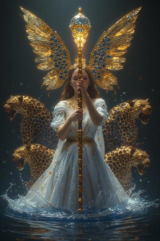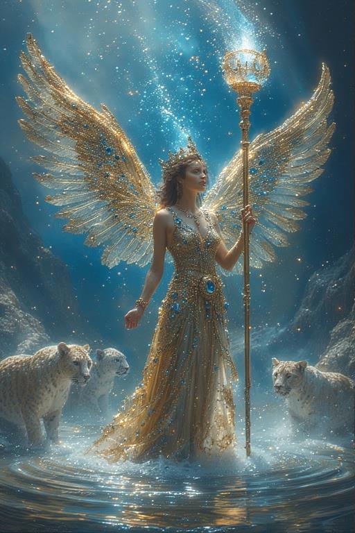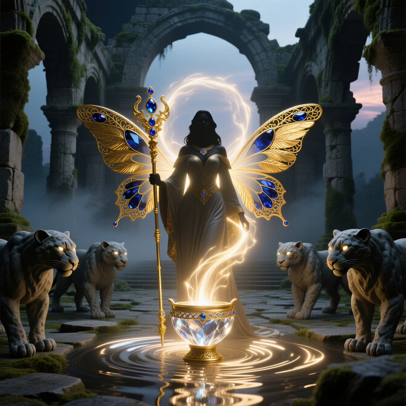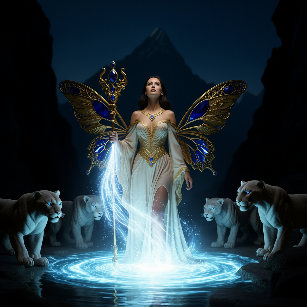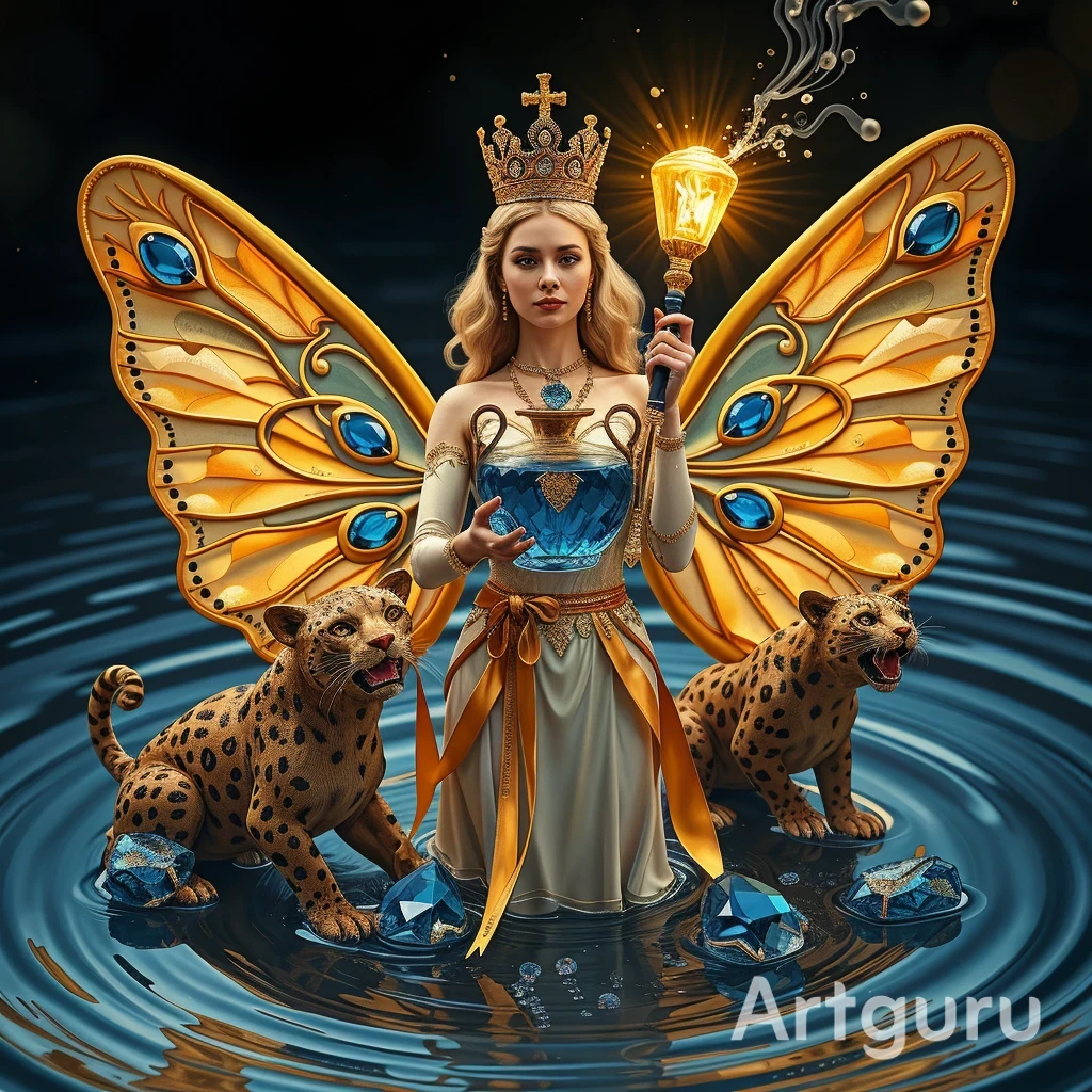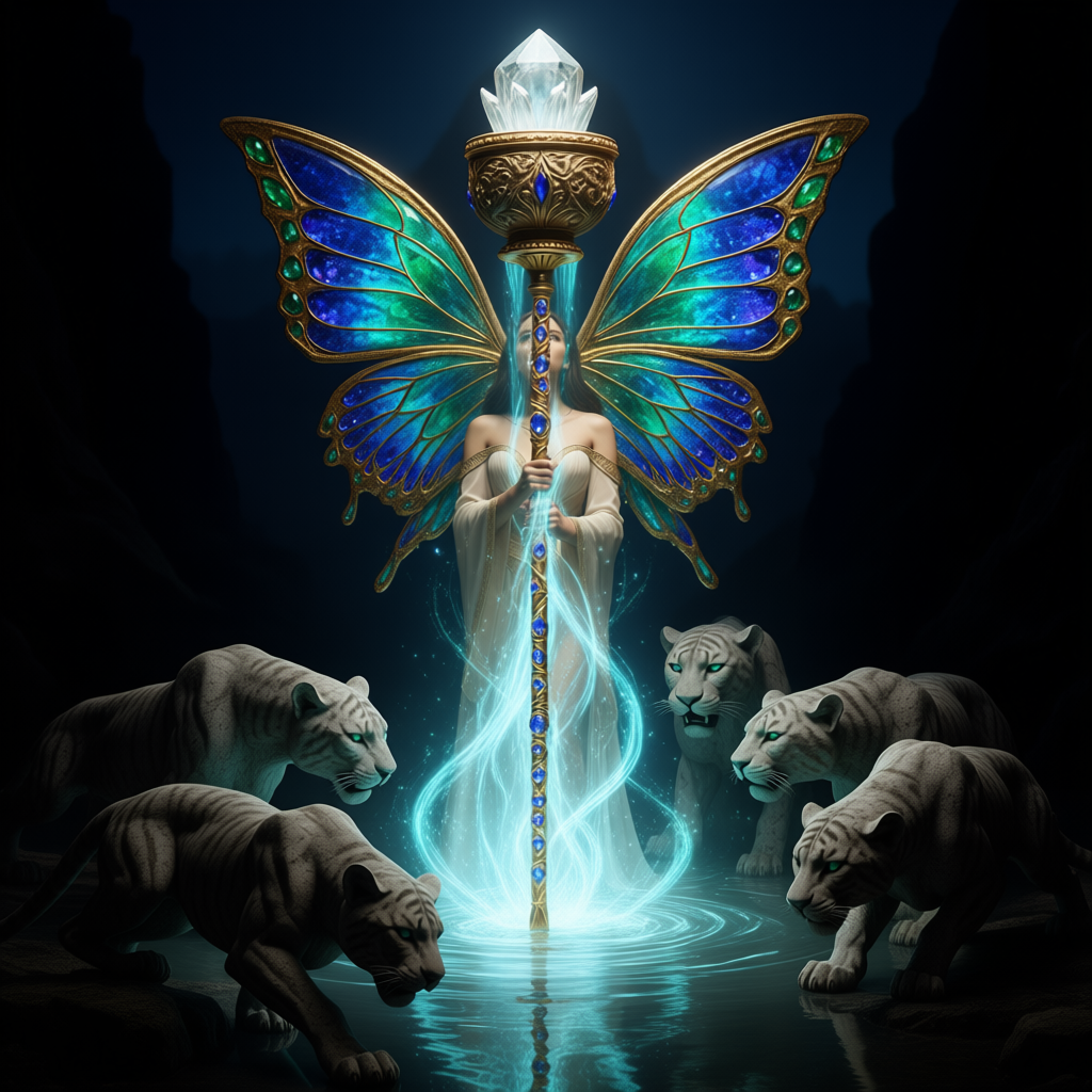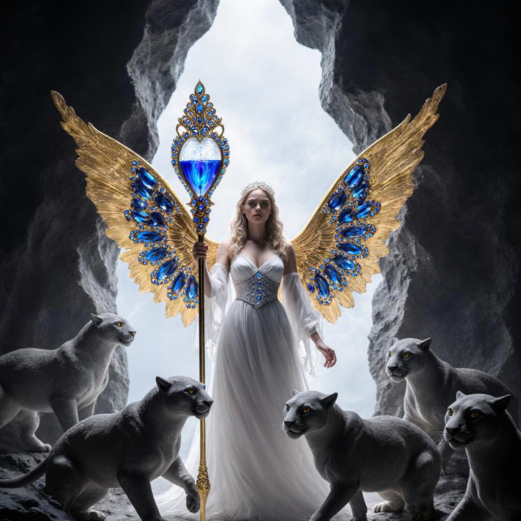 "И тут с эстрады грянула музыка, а тот же голос торжественно произнёс, так как сквозь рябь портала показалась женская фигура, с золотым, и украшенным сапфирами, жезлом в руке, заканчивавшегося на верхушке сосудом из резного хрусталя. При этом жезл, с двух сторон, украшали золотые крылья. В форме крыльев бабочки, но как будто составленных из перьев, с эмалью в цвет сапфира. И обрамлённых золотой окантовкой. И это было не только уловитель арканы, но и защита для кисти руки. К тому же, Элана заметила, что заключённая в сосуде жидкость испускает буквально светящийся поток магической энергии. При этом королеву так же окружила пятерка каменных пантер, с камнями знакомых цветов: