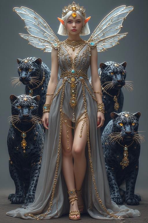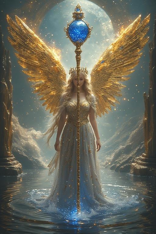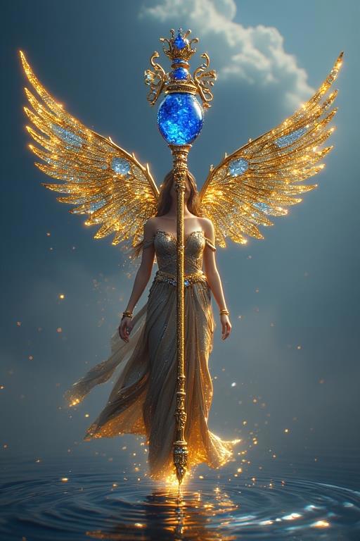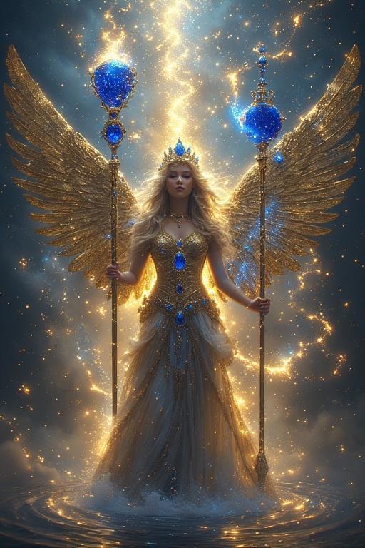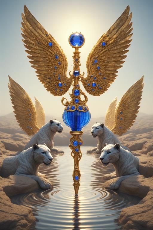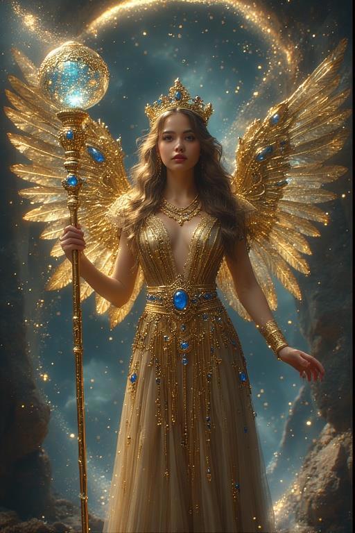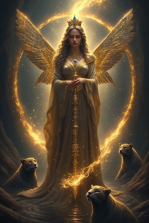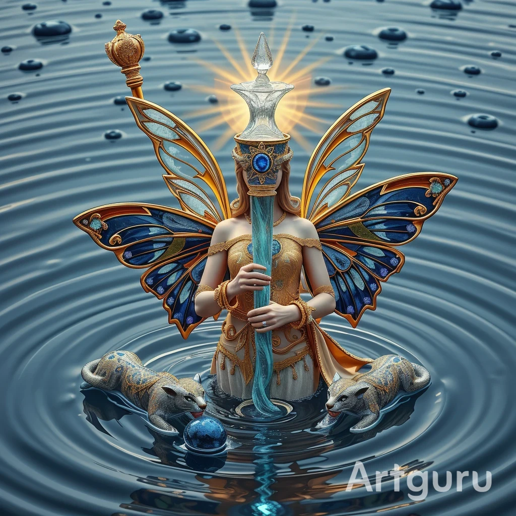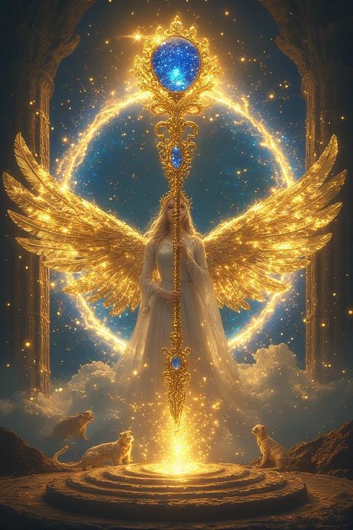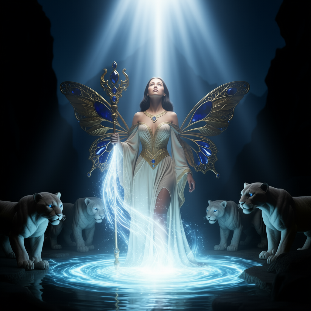 "И тут с эстрады грянула музыка, а тот же голос торжественно произнёс, так как сквозь рябь портала показалась женская фигура, с золотым, и украшенным сапфирами, жезлом в руке, заканчивавшегося на верхушке сосудом из резного хрусталя. При этом жезл, с двух сторон, украшали золотые крылья. В форме крыльев бабочки, но как будто составленных из перьев, с эмалью в цвет сапфира. И обрамлённых золотой окантовкой. И это было не только уловитель арканы, но и защита для кисти руки. К тому же, Элана заметила, что заключённая в сосуде жидкость испускает буквально светящийся поток магической энергии. При этом королеву так же окружила пятерка каменных пантер, с камнями знакомых цветов:
