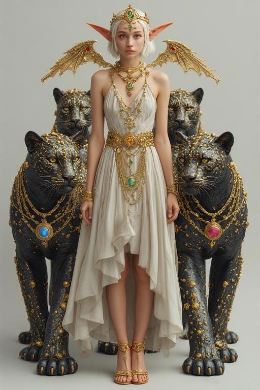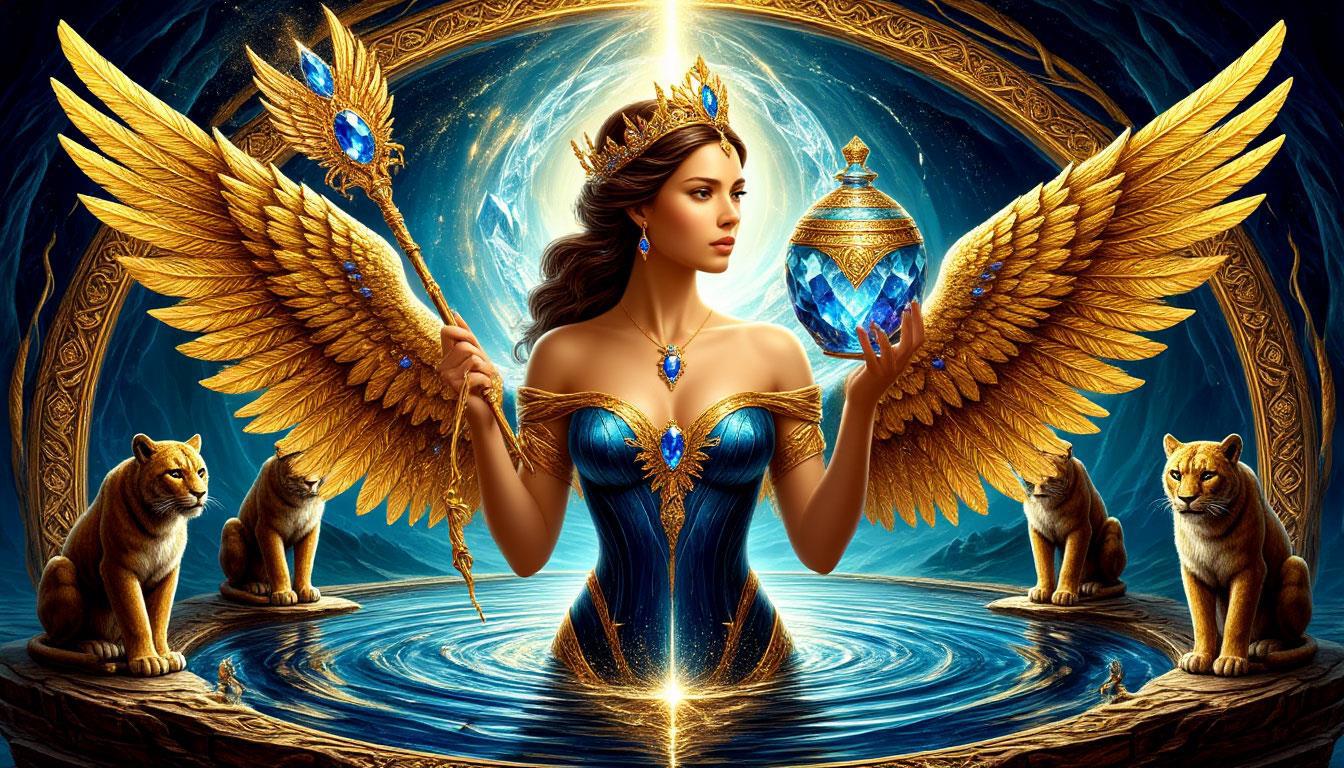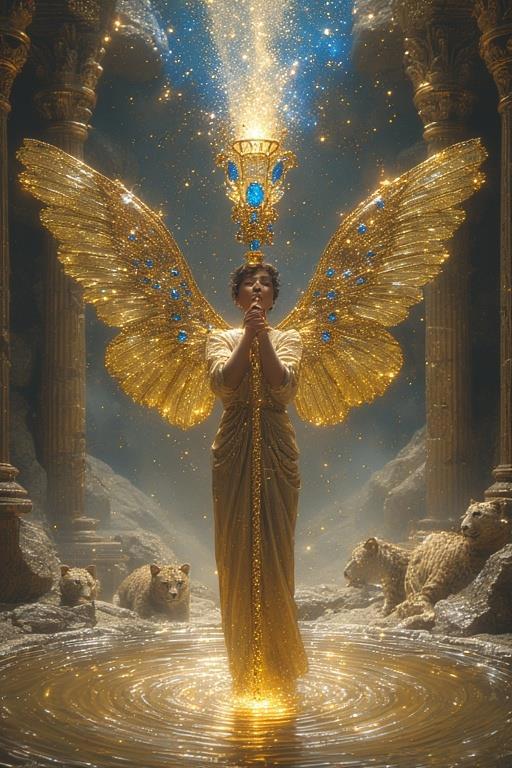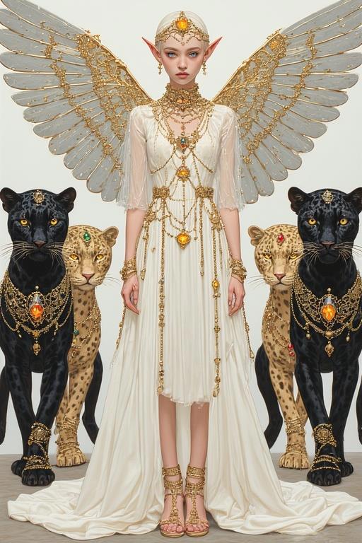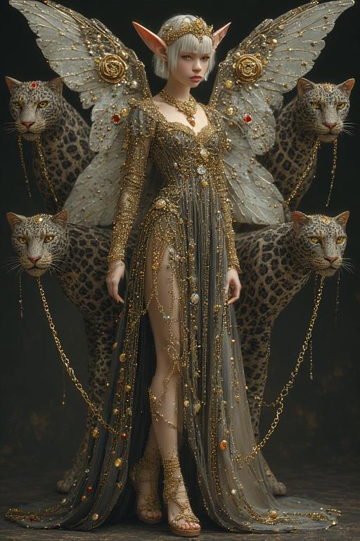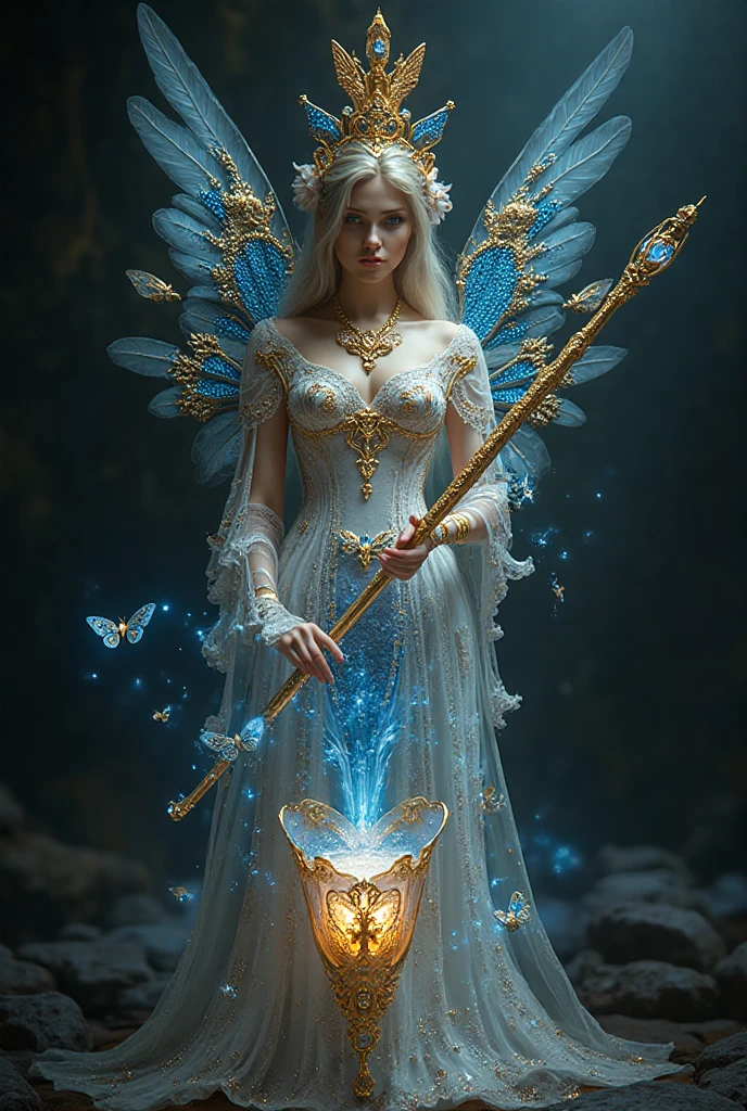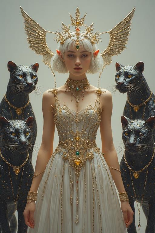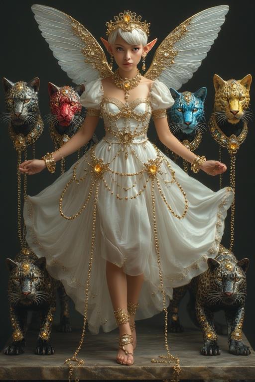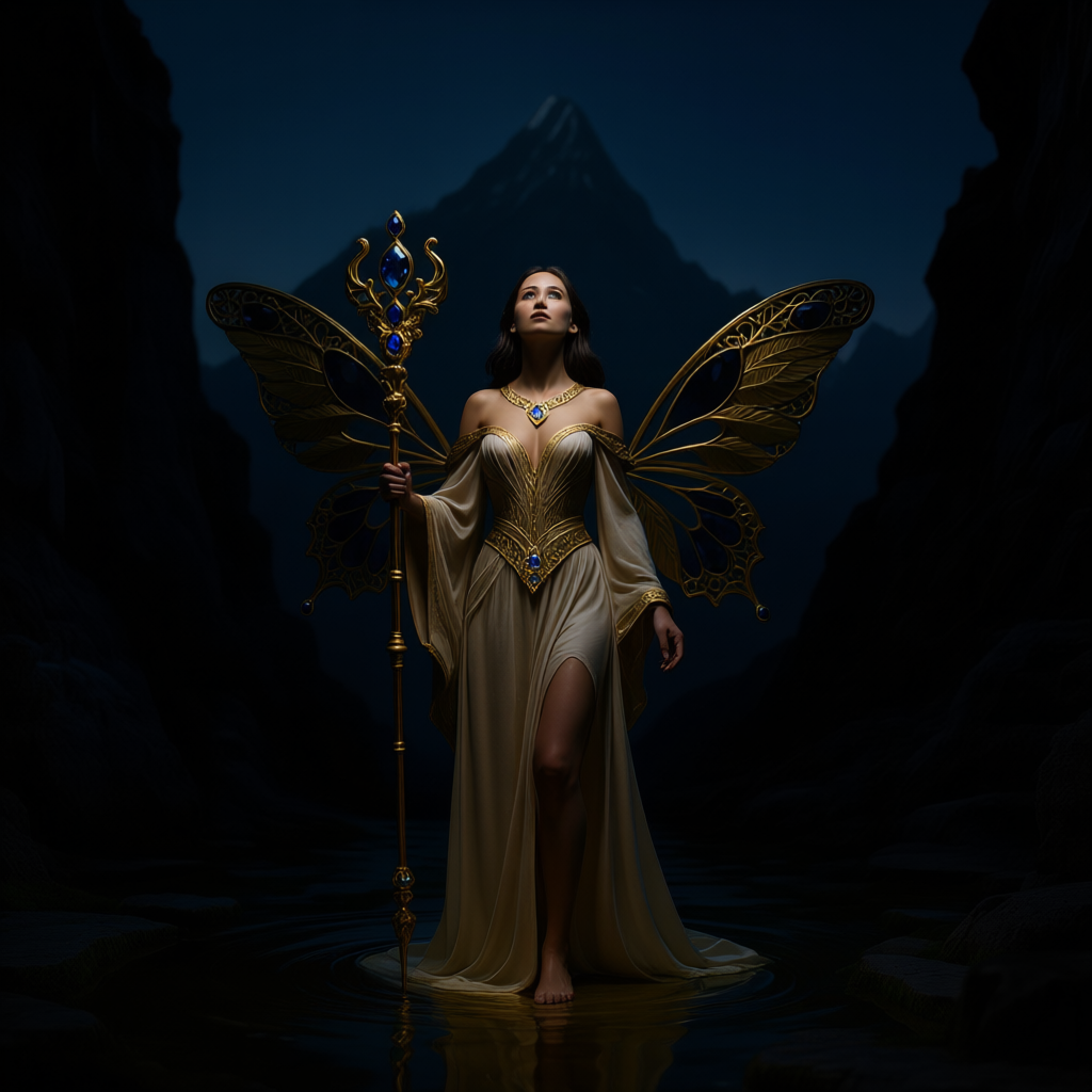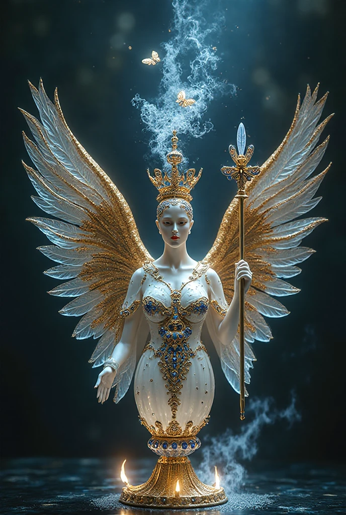 "И тут с эстрады грянула музыка, а тот же голос торжественно произнёс, так как сквозь рябь портала показалась женская фигура, с золотым, и украшенным сапфирами, жезлом в руке, заканчивавшегося на верхушке сосудом из резного хрусталя. При этом жезл, с двух сторон, украшали золотые крылья. В форме крыльев бабочки, но как будто составленных из перьев, с эмалью в цвет сапфира. И обрамлённых золотой окантовкой. И это было не только уловитель арканы, но и защита для кисти руки. К тому же, Элана заметила, что заключённая в сосуде жидкость испускает буквально светящийся поток магической энергии. При этом королеву так же окружила пятерка каменных пантер, с камнями знакомых цветов:
