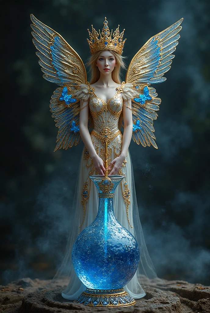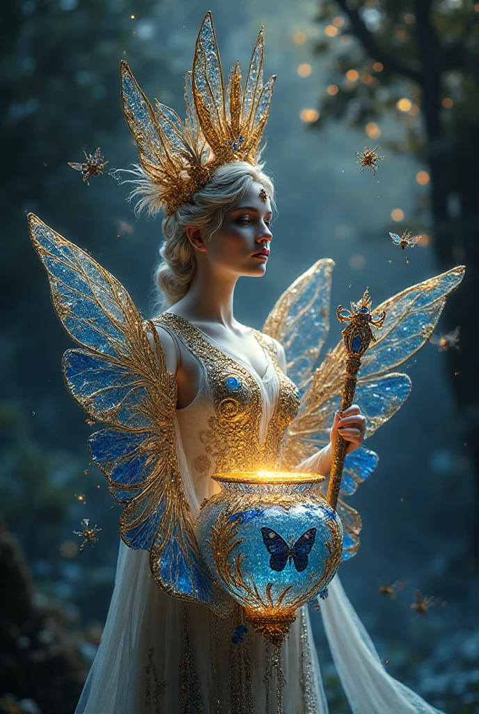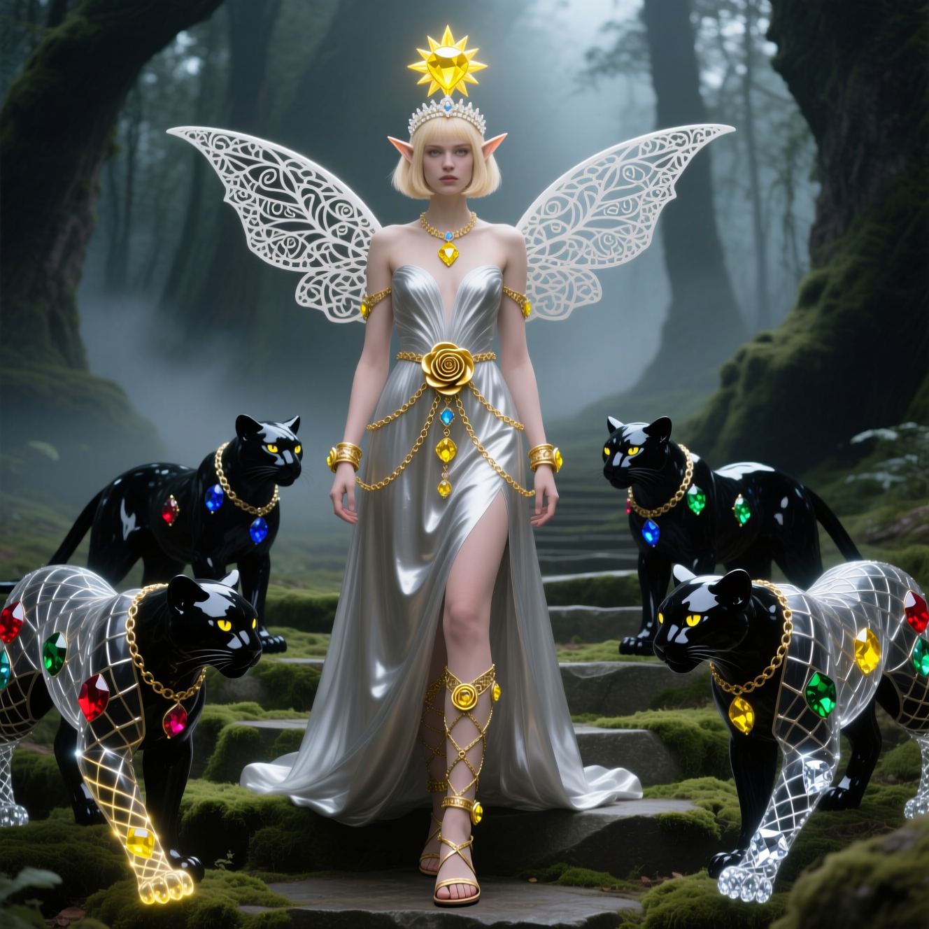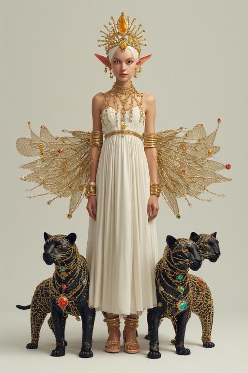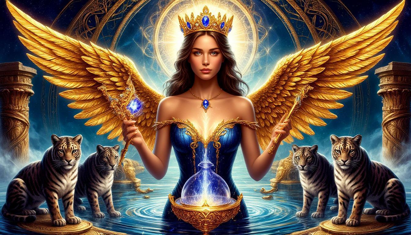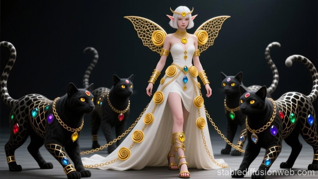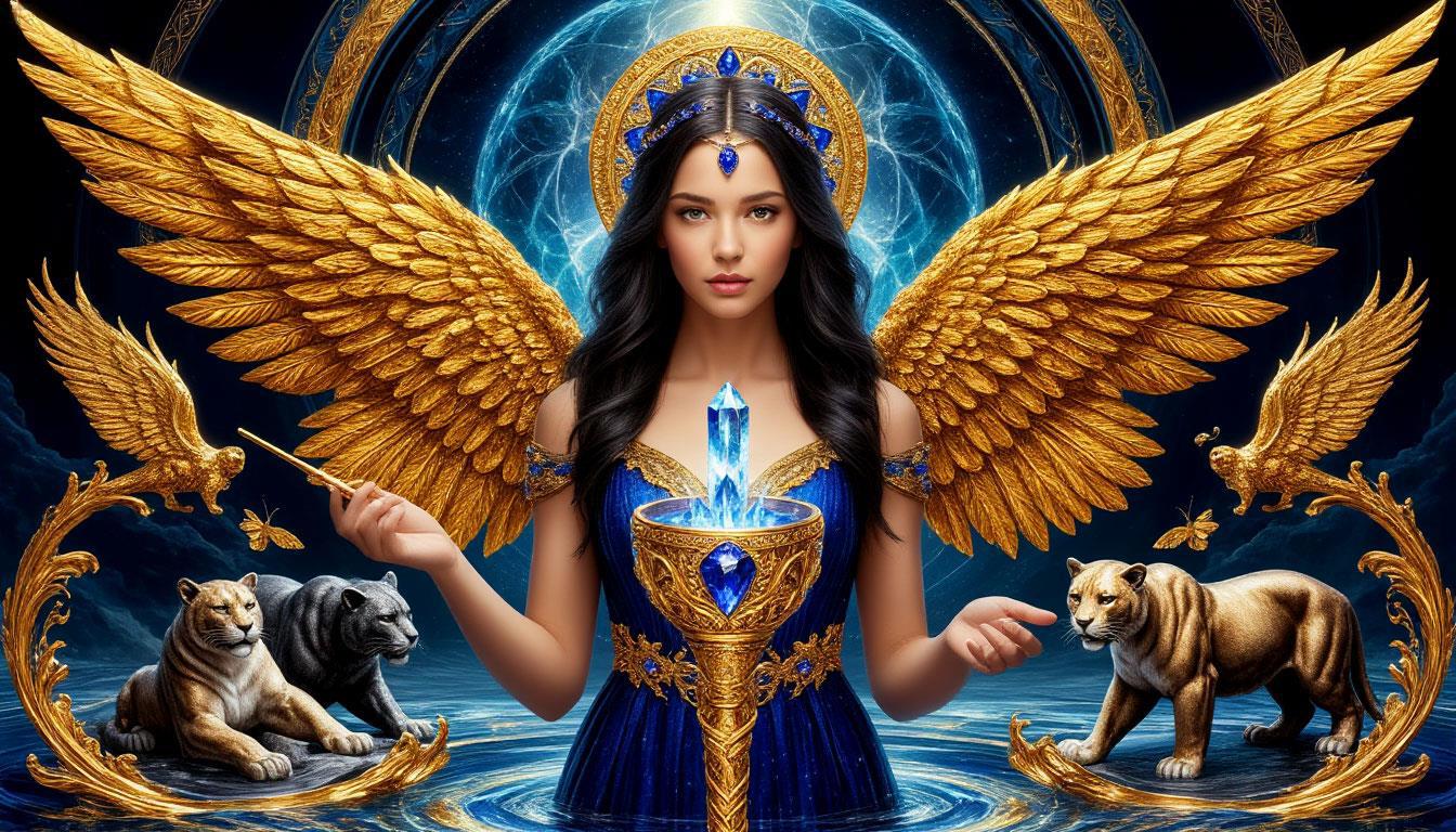 "И тут с эстрады грянула музыка, а тот же голос торжественно произнёс, так как сквозь рябь портала показалась женская фигура, с золотым, и украшенным сапфирами, жезлом в руке, заканчивавшегося на верхушке сосудом из резного хрусталя. При этом жезл, с двух сторон, украшали золотые крылья. В форме крыльев бабочки, но как будто составленных из перьев, с эмалью в цвет сапфира. И обрамлённых золотой окантовкой. И это было не только уловитель арканы, но и защита для кисти руки. К тому же, Элана заметила, что заключённая в сосуде жидкость испускает буквально светящийся поток магической энергии. При этом королеву так же окружила пятерка каменных пантер, с камнями знакомых цветов: