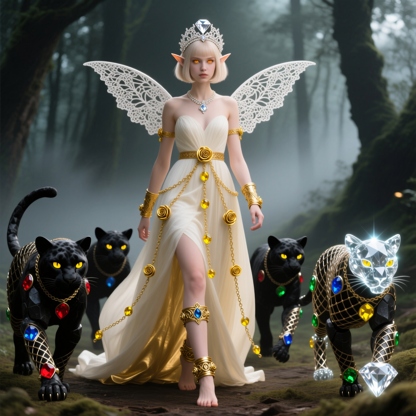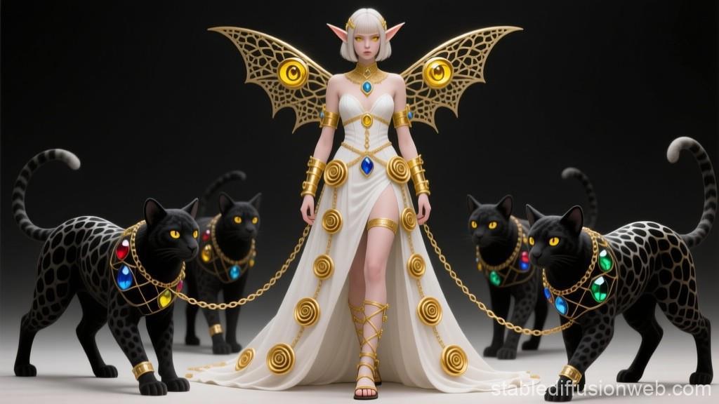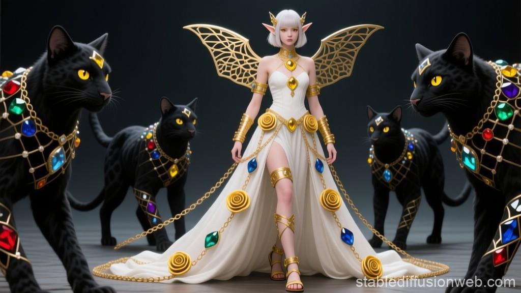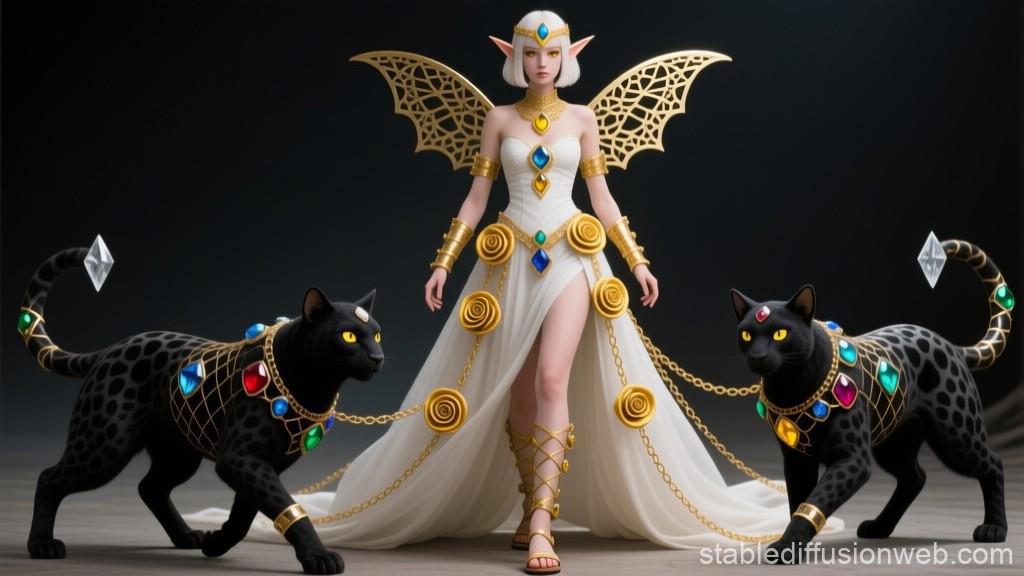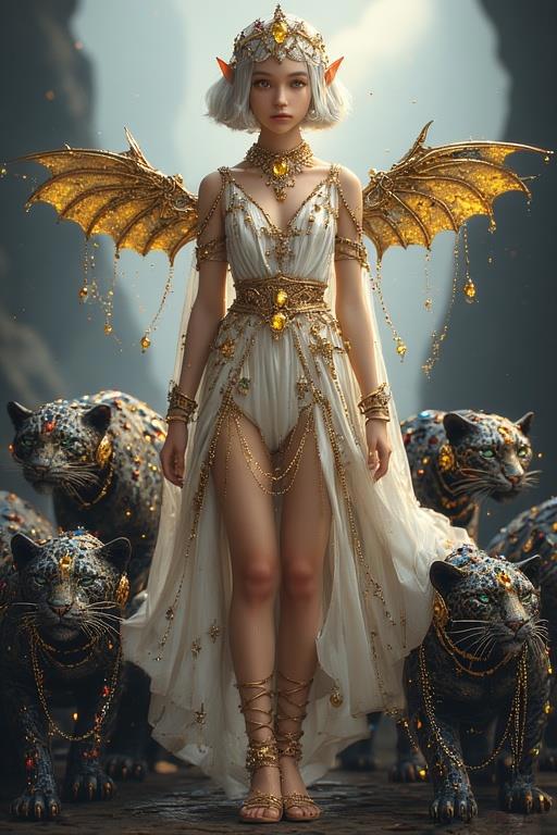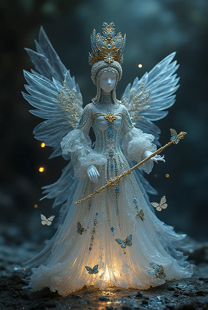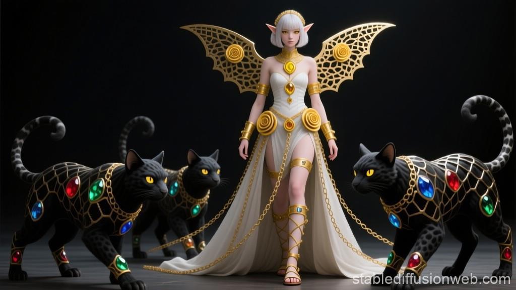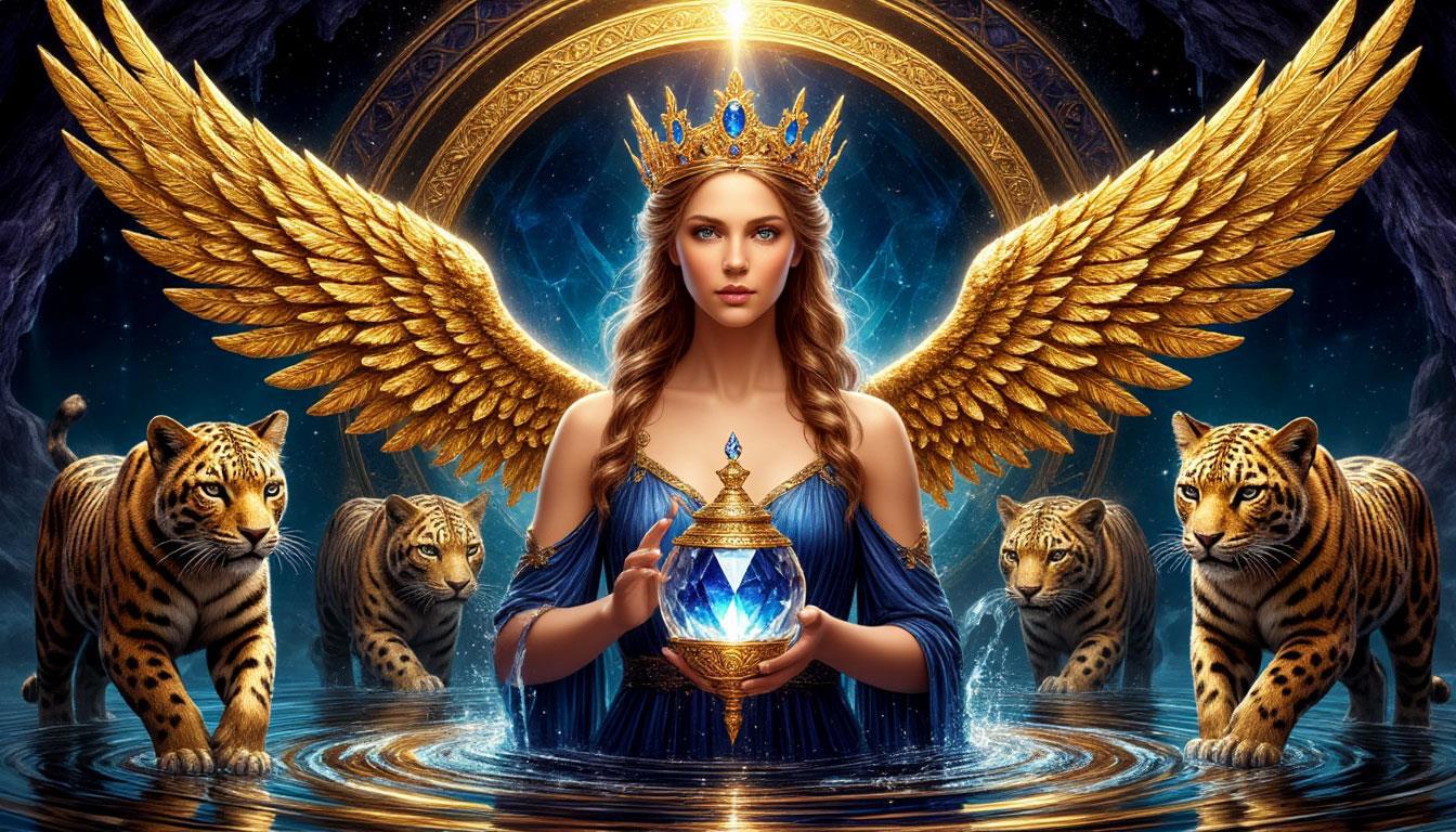 "И тут с эстрады грянула музыка, а тот же голос торжественно произнёс, так как сквозь рябь портала показалась женская фигура, с золотым, и украшенным сапфирами, жезлом в руке, заканчивавшегося на верхушке сосудом из резного хрусталя. При этом жезл, с двух сторон, украшали золотые крылья. В форме крыльев бабочки, но как будто составленных из перьев, с эмалью в цвет сапфира. И обрамлённых золотой окантовкой. И это было не только уловитель арканы, но и защита для кисти руки. К тому же, Элана заметила, что заключённая в сосуде жидкость испускает буквально светящийся поток магической энергии. При этом королеву так же окружила пятерка каменных пантер, с камнями знакомых цветов: