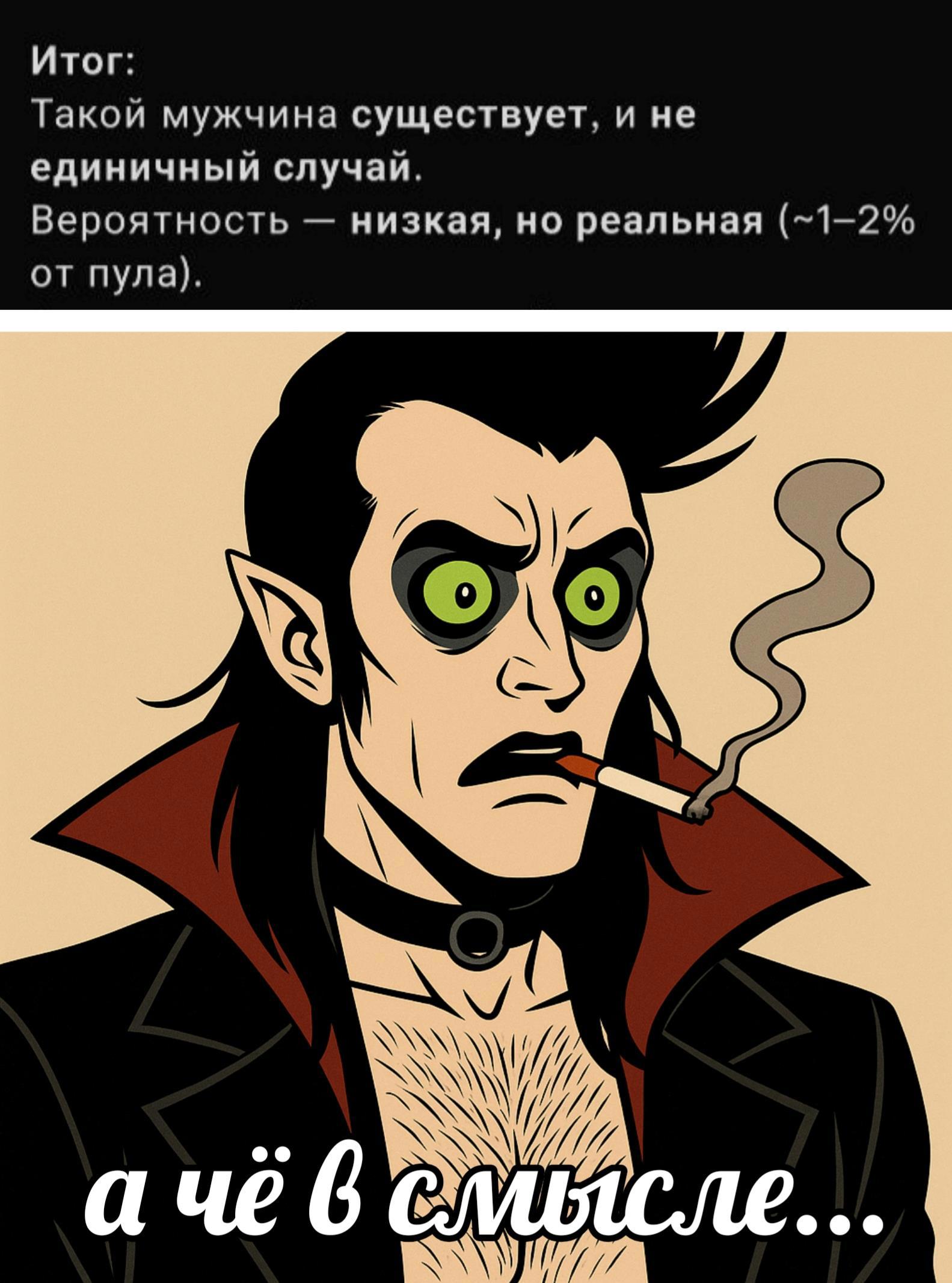 P. P. S. На этот раз ChatGPT сделал его уши слишком острыми, хотя в его каноничном образе они тоже имеют схожесть с вампирскими ушками — в главе «Без смазки» я упоминала, что он сам специально сломал их, чтобы придать им острототу и выглядеть ещё более фриковато и дерзко