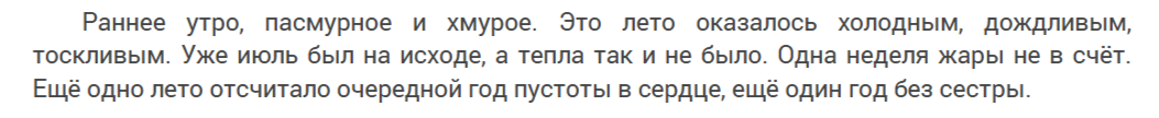 Есть ощущение незаконченности. История Маришки заслуживает того, чтобы быть исследованной. Что в итоге произошло? Что стало причиной ее внутренней трансформации? Но это моё личное впечатление. Прошу не считать это критикой, ибо и сама в определенных произведениях грешу незаконченностью и допускаю ее, если основное уже сказано, а остальное несущественно)