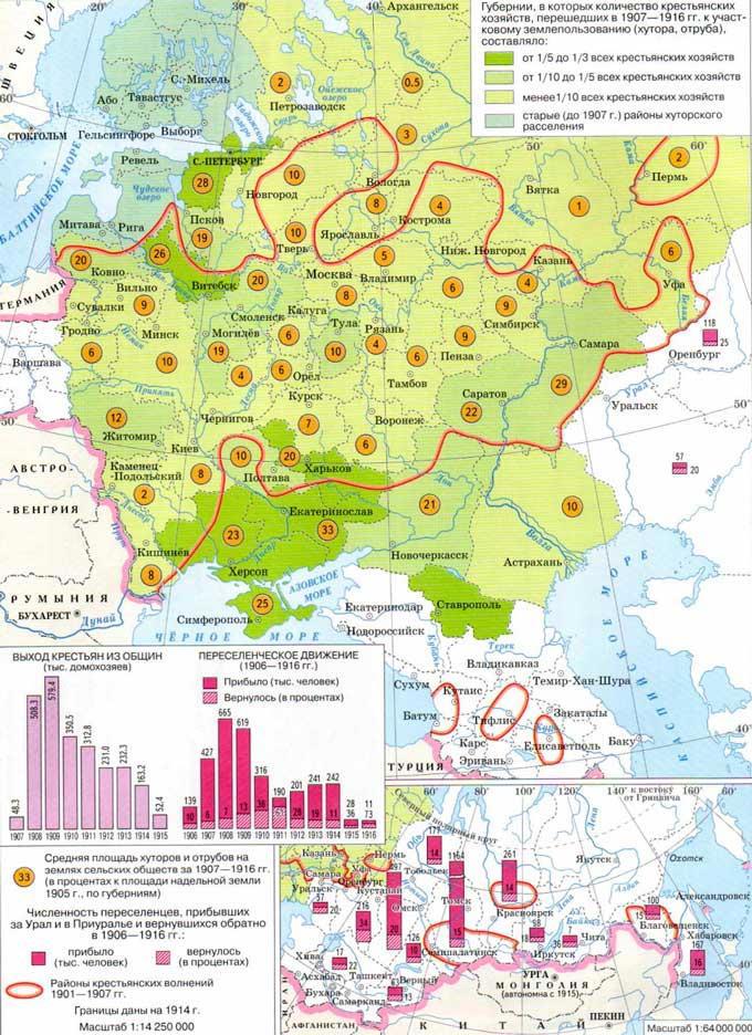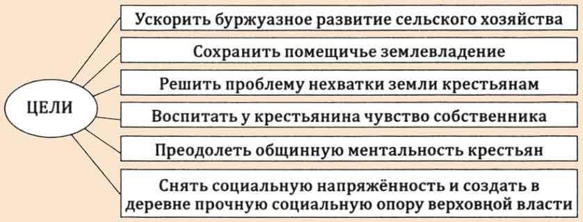 - Повышение эффективности крестьянского сельского хозяйства; правительственные мероприятия состояли прежде всего в поощрении выделения крестьянам-собственникам участков «к одному месту» (отруба, хутора), что требовало проведения силами государства огромного объёма сложных и дорогостоящих землеустроительных работ по разверстанию чересполосных общинных земель.