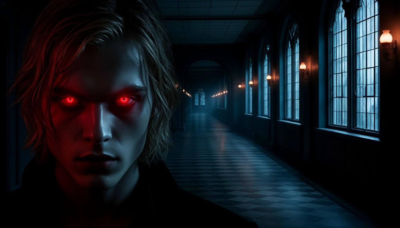 Повернувшись, она уставилась в кромешную темноту той части коридора, которая не освещалась луной. Из непроглядной мглы на неё таращились два огненно-красных глаза. Затем таинственный преследователь вышел на свет. Это оказался тот парень с лекции. Улыбаясь, он, медленно и плавно скользя по полу, направился в сторону девушки.