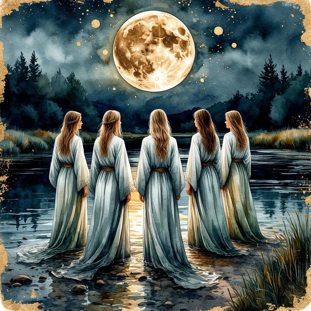 Автор: Ирина ВалеринаНад рекой опустилась ночь — густая, бархатная, почти осязаемая. Бездонное звёздное небо опрокинулось в чёрную, неподвижную воду, и берега исчезли, растворились. Весь мир превратился в лодку, плывущую по безмолвной, мерцающей пустоте, где внизу было то же, что и вверху — бесконечность. И в этой двойной бесконечности, медленно и величаво, двигались они — невесомые, прекрасные и вечные в своём печальном предназначении. Их длинные волосы и струящиеся одежды тянулись за ними, как шлейфы из лунного света. Русалки скользили по зеркальной глади, в которой тонули алмазные россыпи созвездий, бледный серп месяца и сама бездна мироздания.