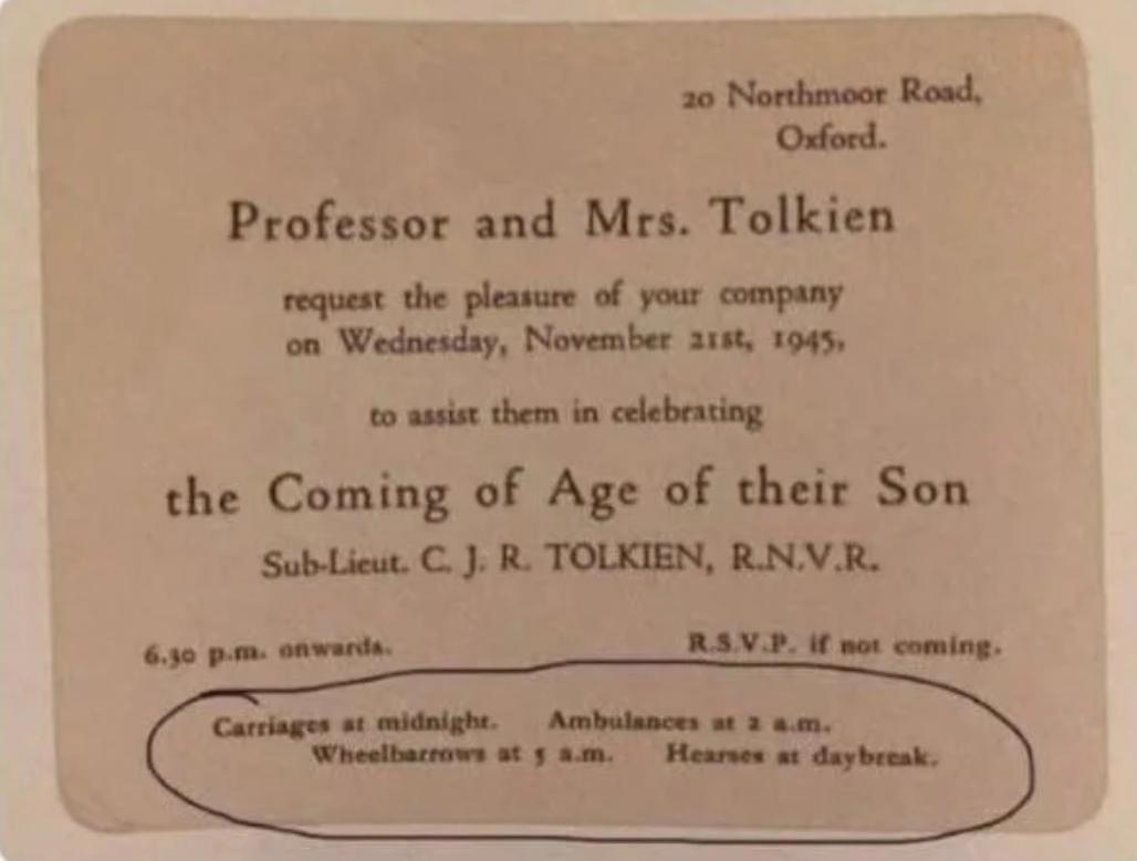 "Профессор и миссис Толкиен имеют честь пригласить вас в среду, 21 ноября 1945 года, разделить с ними празднование совершеннолетия их сына, младшего лейтенанта К. Дж. Р. Толкиена, Королевский военно-морской добровольческий резерв.