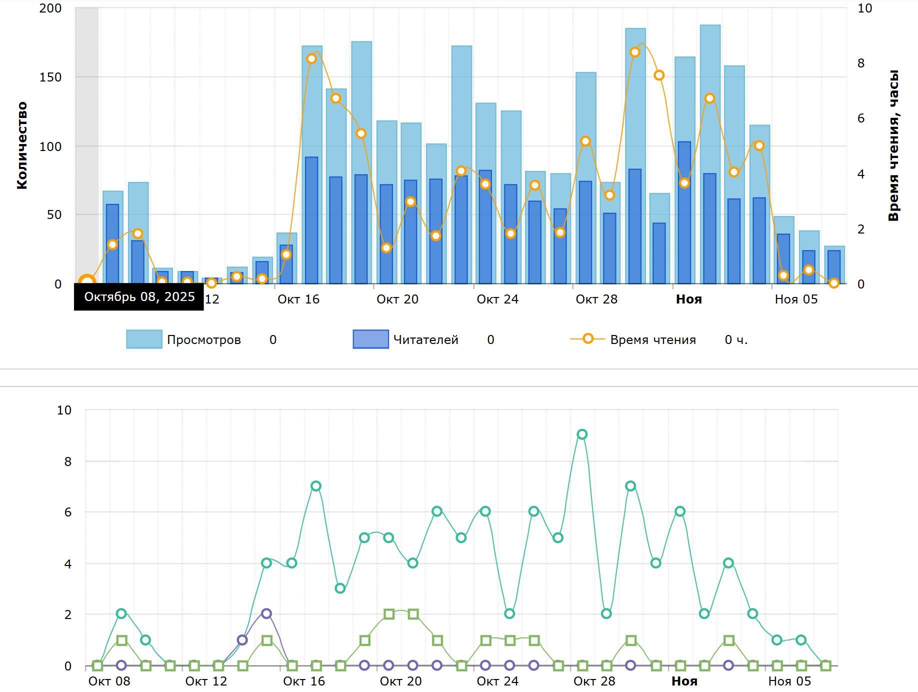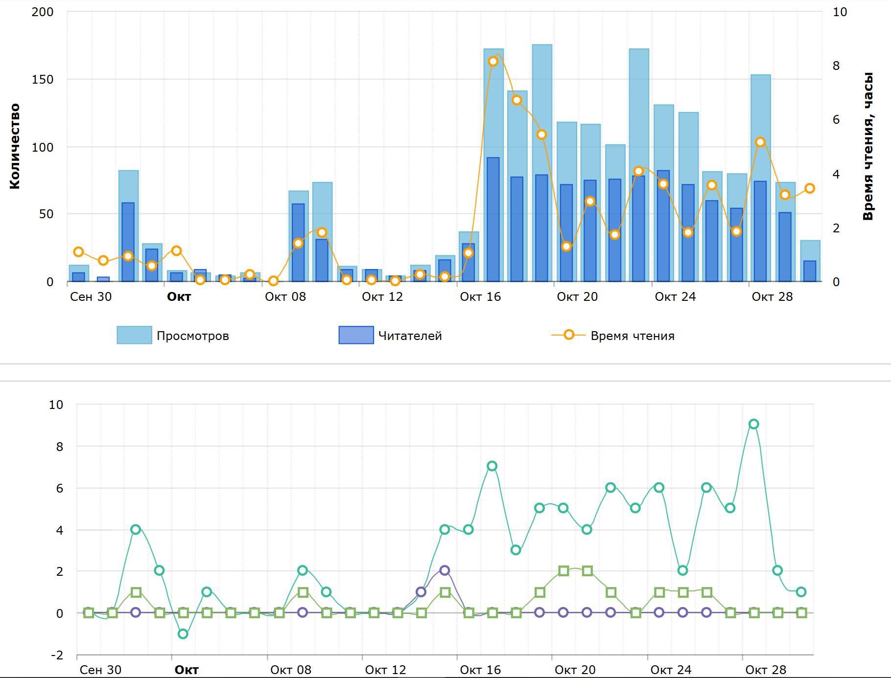 До 16 октября успела выложить 8 глав в режиме еженедельной выкладки новой главы вечером в четверг. По приросту библиотек на одну главу нет особой разницы между двумя режимами, но по часам чтения очень большая разница. Если при еженедельной выкладке читали примерно один день в неделю час или два в день, то при ежедневной выкладке в удачные дни читали по 6-8 часов в день, в обычные – по 2-4 часа, в неудачные – час или два. Если кому интересны более точные подробности, то ниже данные по приросту библиотек и стандартные графики АТ с часами чтения.