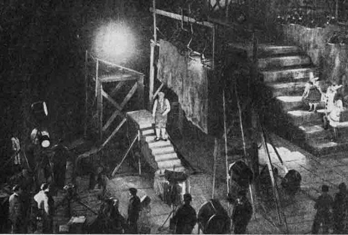 Карло стоит на обычной лестнице, далеко от него на заднем плане - специально построенные огромные ступени, на которых тусят актеры-куклы. Надо "всего лишь" совместить оба плана на пленке так, чтобы зритель ни о чем не догадался.
