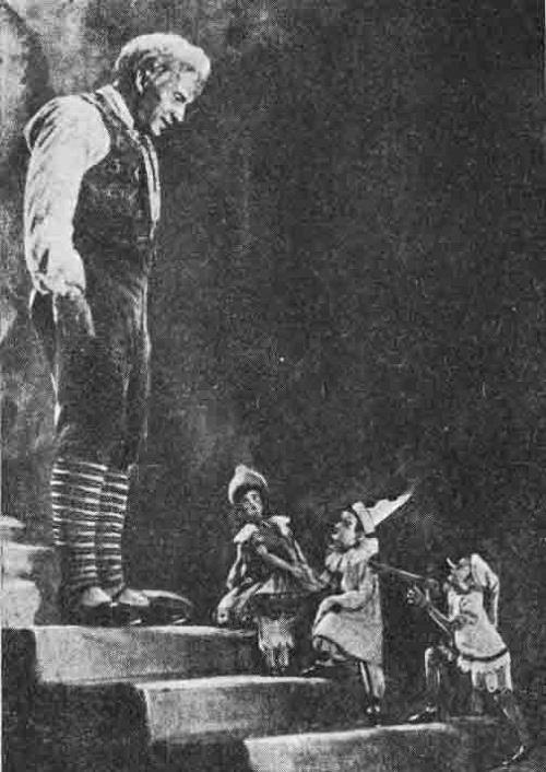 Вот, например, кадр из фильма: папа Карло (Георгий Уваров) стоит на лестнице, а перед ним — маленькие Буратино, Мальвина (Тамара Адельгейм) и Пьеро (Раиса Хаирова).