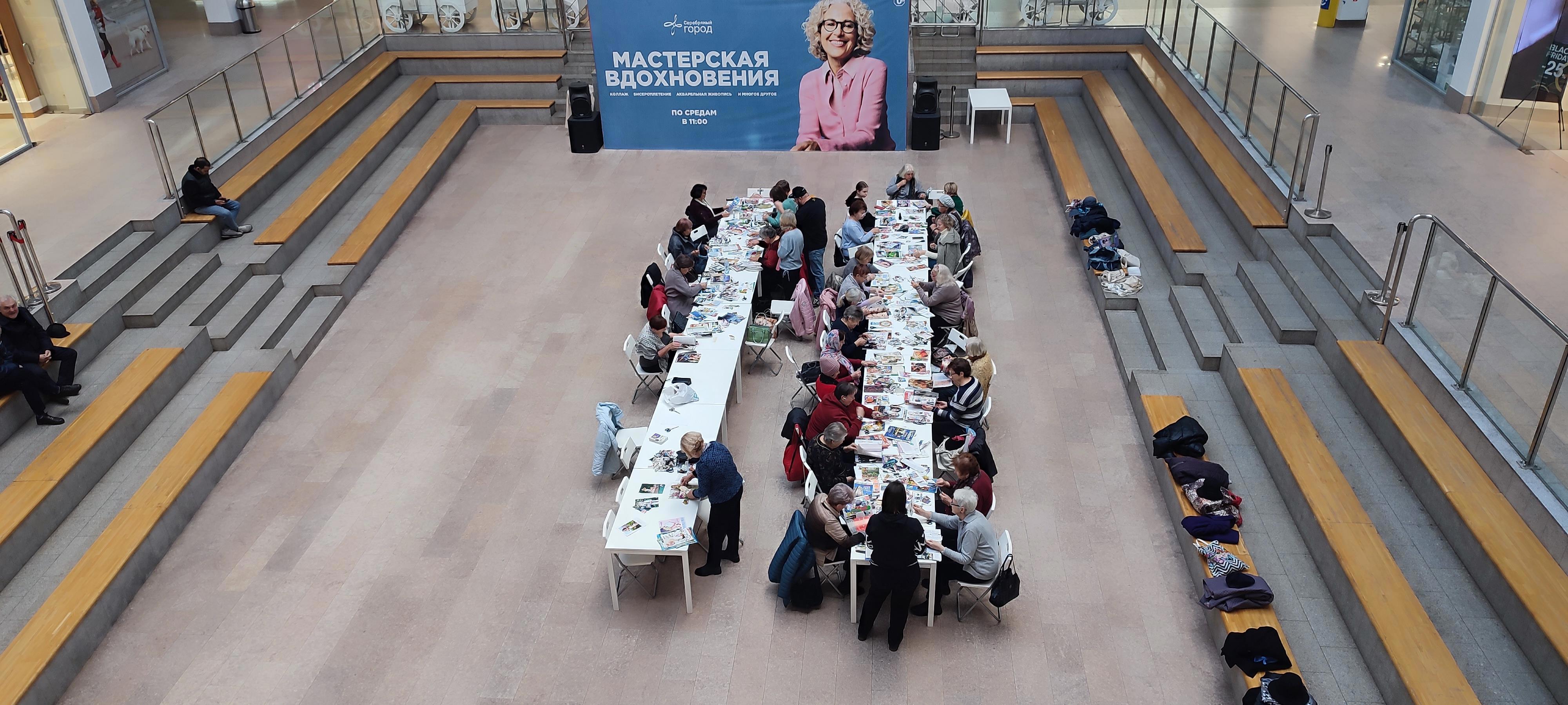 Люди старшего поколения приходят, на столах куча журналов, они вырезают то что им интересно, делают коллажи,