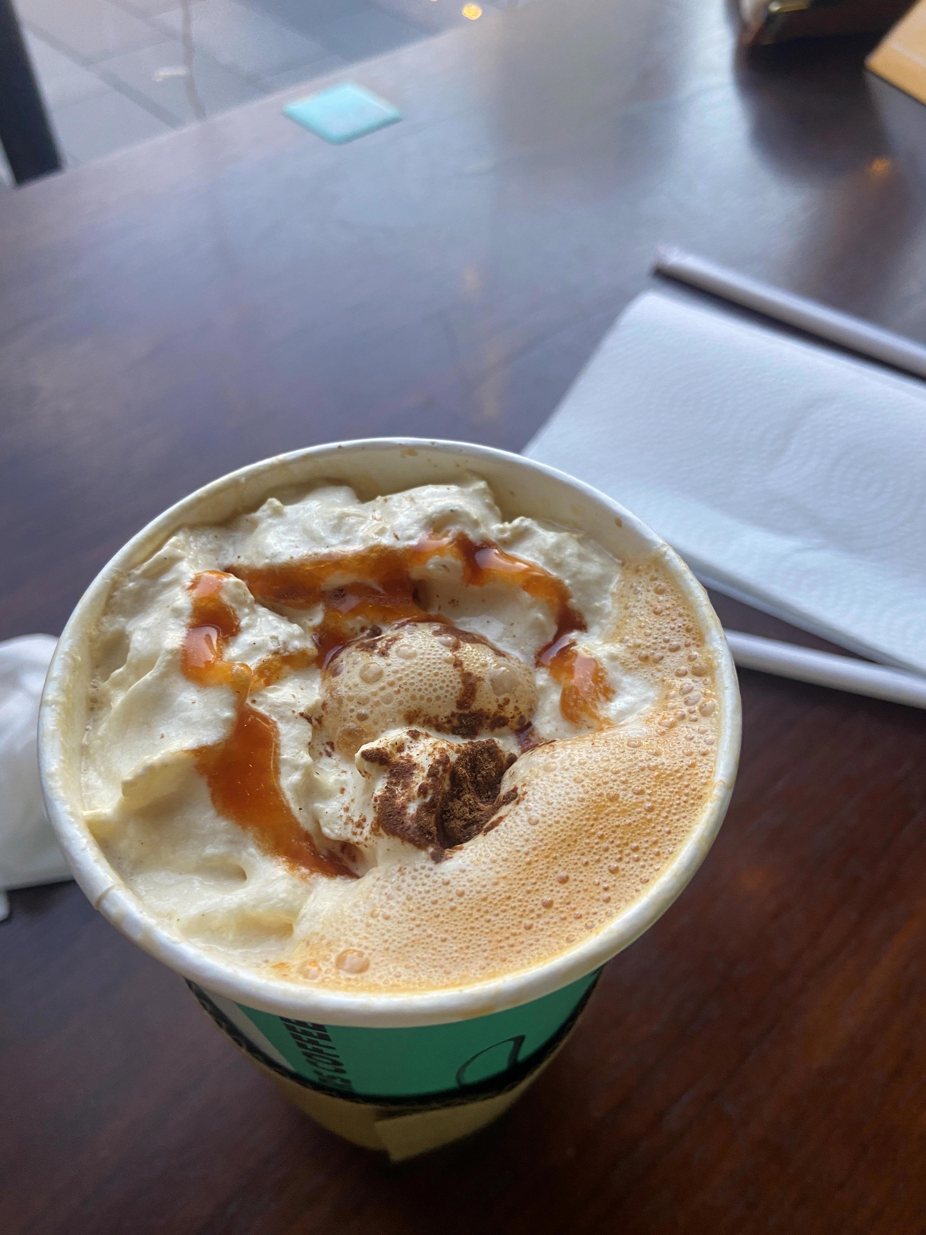 ЭТО ЧТО ЗА НЯШЕЧКА ВКУСНЯШЕЧКА. Я никаких надежд не ставила, рассчитывала на лёгкие нотки или просто запах тыквы, но там был полноценный вкусный вкус! 290р за 0,4 это очень хорошо, я в шоке. Сливок, семечек или карамели тут нет, хотя карамель была заявлена. Приятно что добавили меньше эспрессо по моей просьбе.
