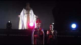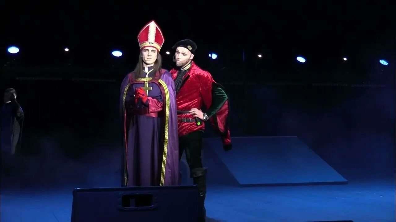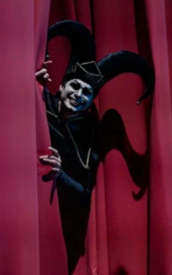 Колпак шута, единственного крупного персонажа "Жанны" без реплик, но активной жестикуляцией, напомнил мне не пога дьявола, а символ бесконечности. Но этот символ в таро ставят над "магом", а не "шутом" - над волевой фигурой, что желает творить реальность. А учитывая, что шут облачён в чёрно-красное, цвета Тьмы и англичан в символическом коде этой оперы, создавалось впечатление, что этот шут олицетворял влияние некого колдуна, что управлял реальностью, не копируя жесты других персонажей, а служа их источником, как кукловод.
