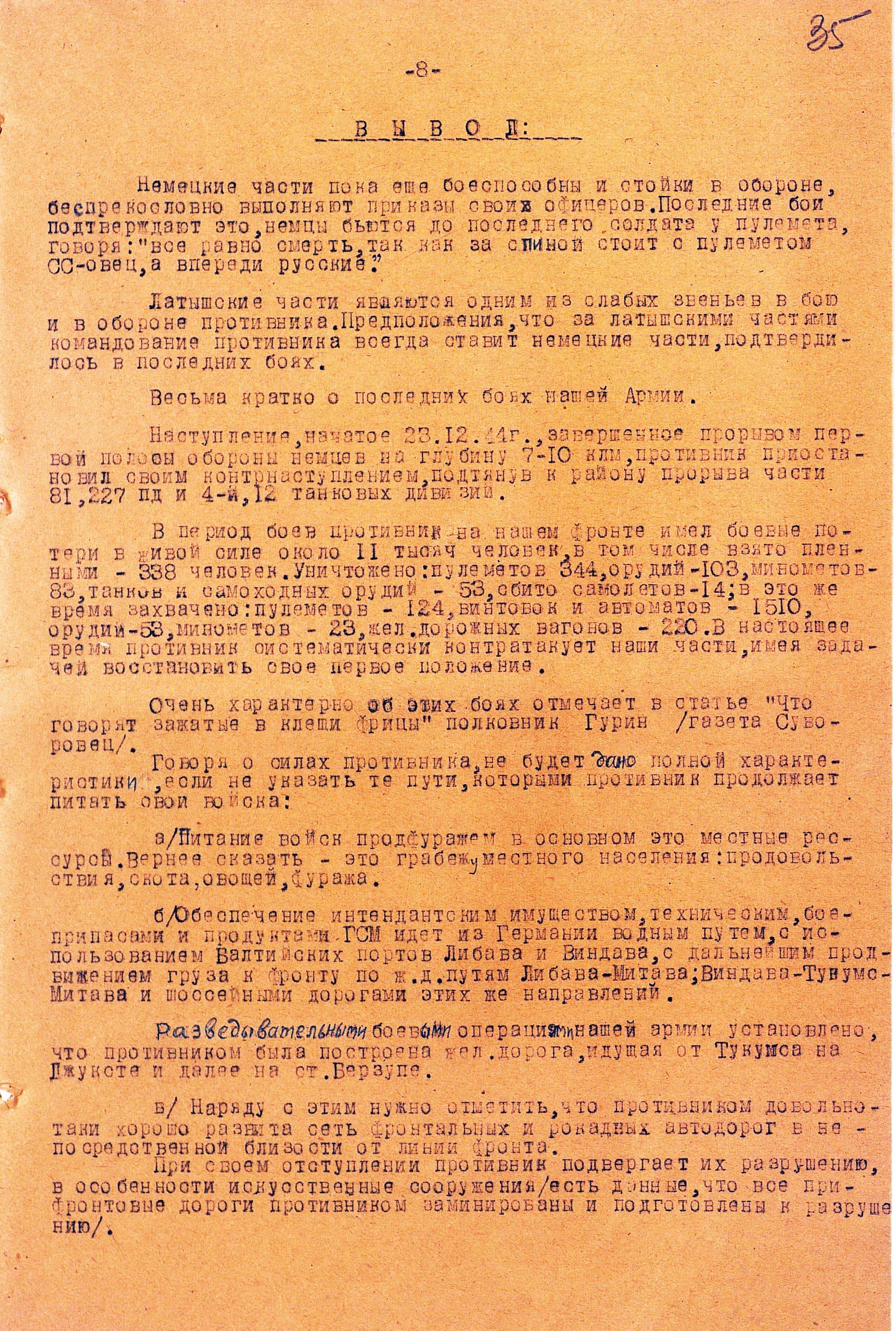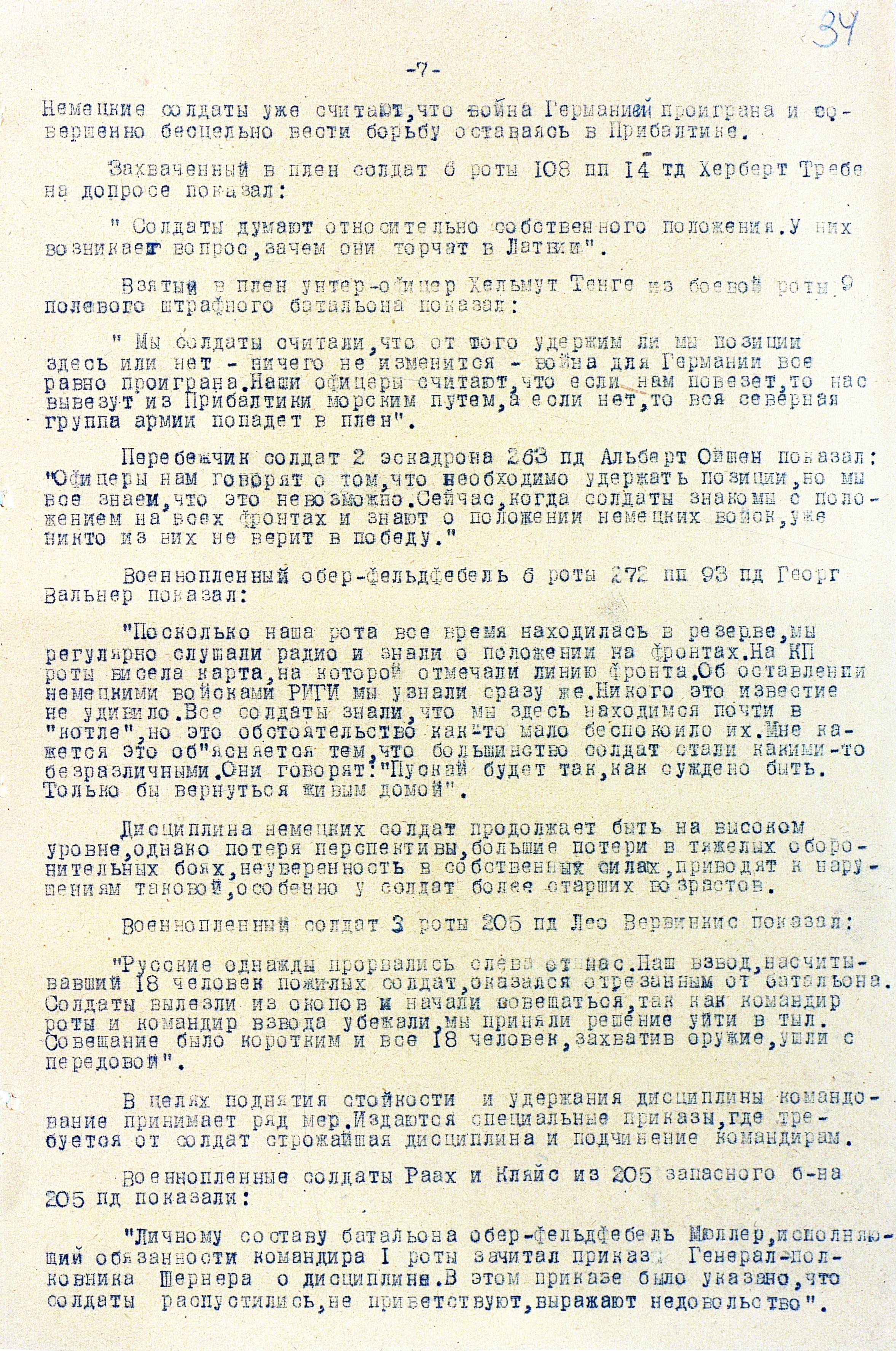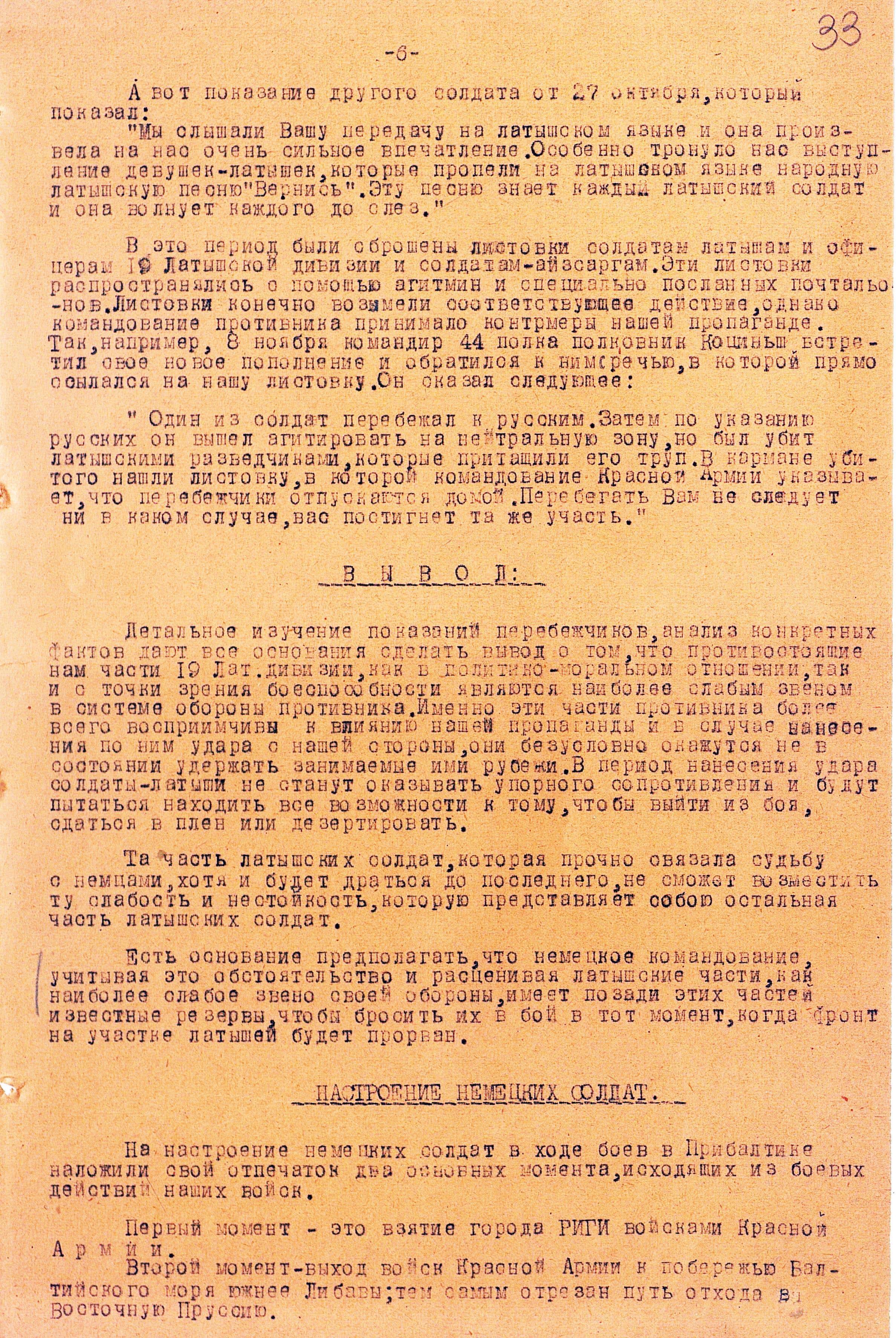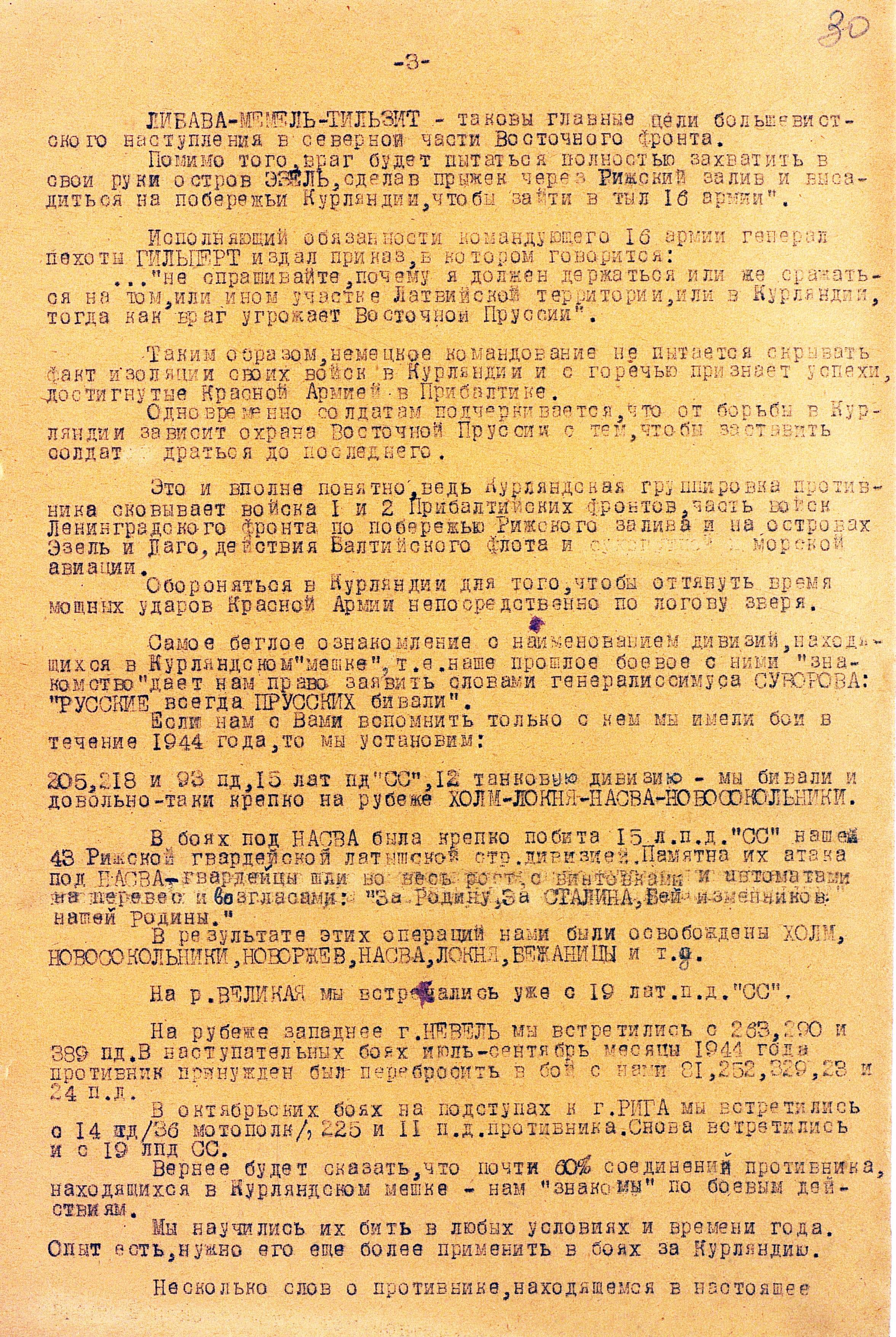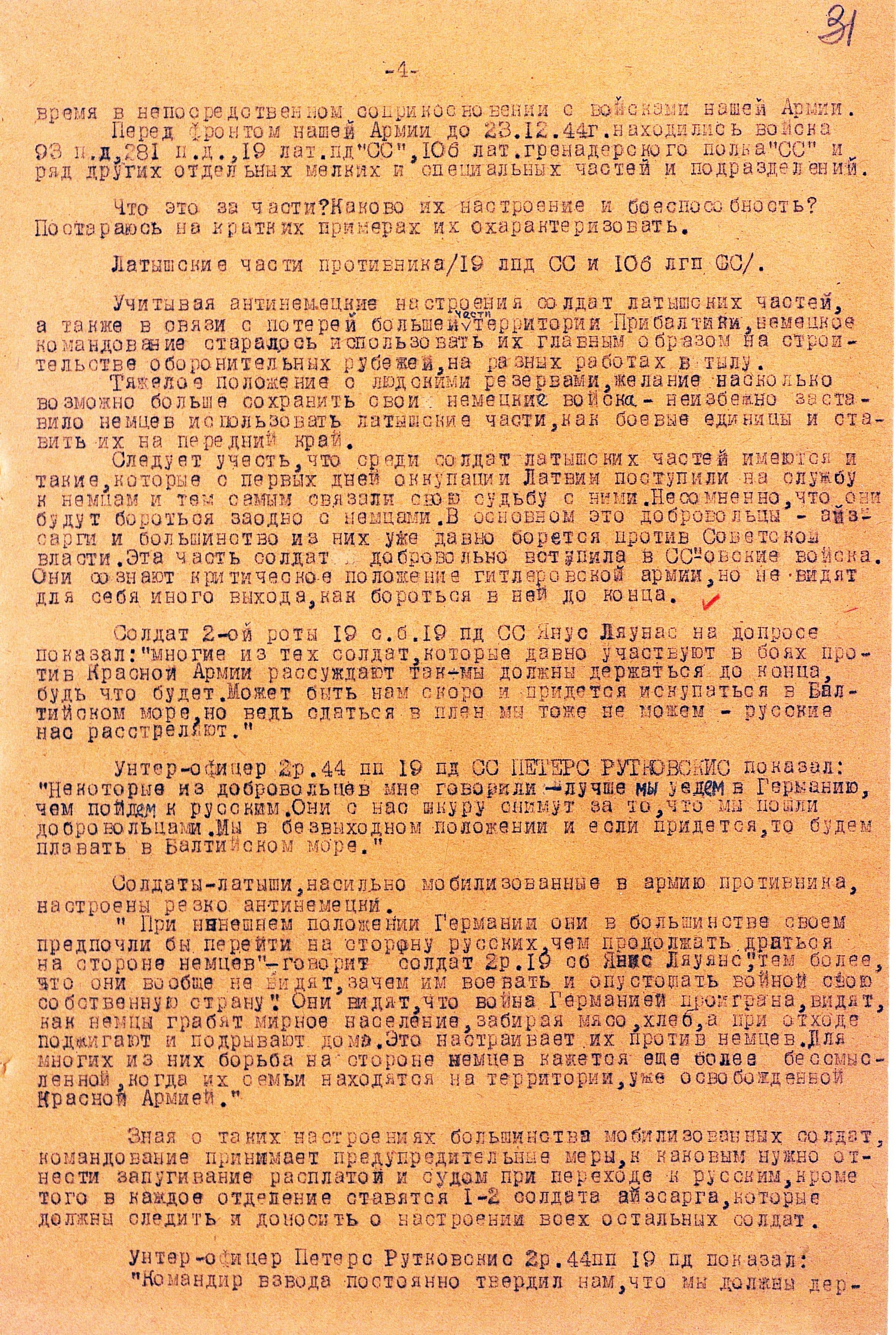 А вот дальше… У меня сложилось впечатление, что Василий Сергеевич сочувствует части латышских эсэсовцев, мобилизованным в армию противника. С гневом обрушиваясь на тех, кто пошёл на немецкую службу добровольцем, докладчик регулярно обращает на антинемецкие настроения мобилизованных, подчеркивает, что в немецкую армию их призвали насильно, и воевать на немцев латыши не хотят. Слабо верится, что именно всё так и было, но с другой стороны, латышские части и в самом деле серьёзно уступали немецким в подготовке, мотивации, стойкости. Они и в самом деле были «слабым звеном в системе обороны противника».