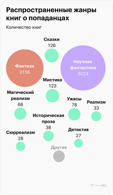 Самая популярная обертка для попаданческой литературы — научная фантастика. Более чем в половине произведений герой действует в мире привычных нам законов природы и общества: таких 57%, или 5024 текста.