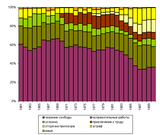 Вывод: в комментах было предположение, что всплеск количества ЗК был в том числе связан с уменьшением процента условных приговоров - всем давали реальный срок. Но нет! Процент реальных сроков в 1980-1986 не увеличивался, а наоборот несколько снижался.