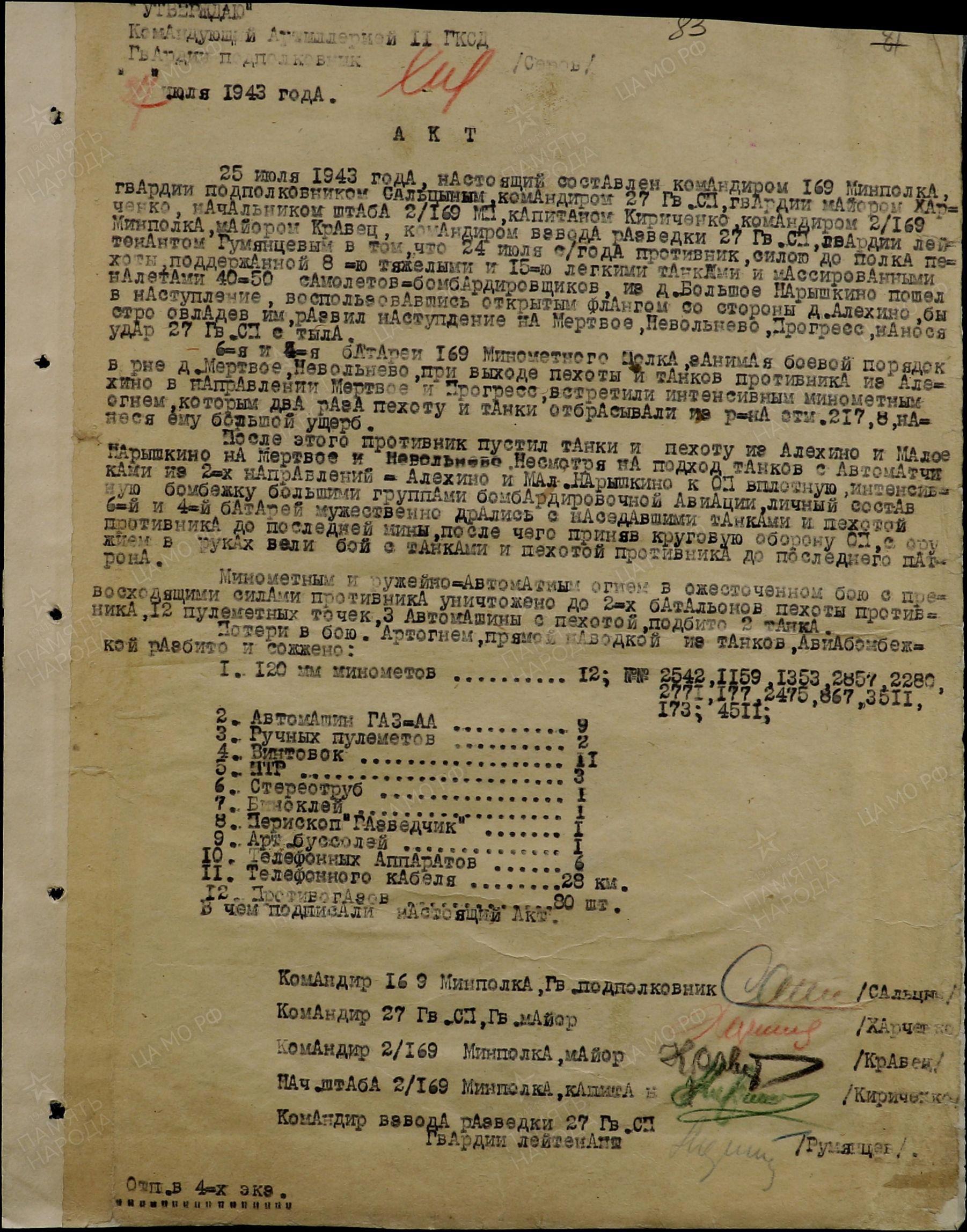Через несколько дней на участке 11-й гв. сд нанесет контрудар дивизия "Великая Германия", под удар немецких танков попадут и батареи 169-ого минометного полка.