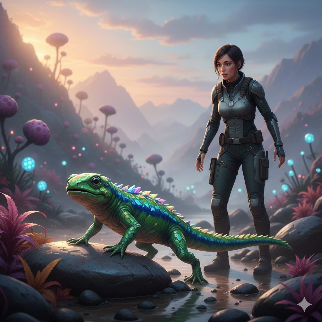 К моменту, когда Лайла уложила все три дрона, на берег бесшумно выбрался тот, кого Джек желал и опасался увидеть последние полминуты. Небольшая, зелёная с синей полосой вдоль тела амфибия на миниатюрных лапках медленно вылезла на блестящий камень. Внешне она напоминала тритона, но кожа походила скорее на какую-то сложную кристаллическую мозаику, чем на кожу животного.