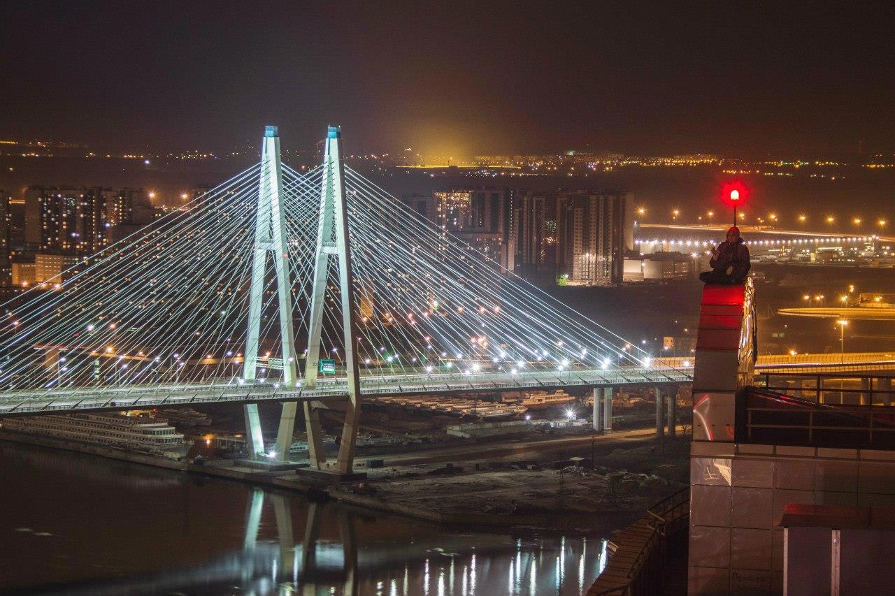 Поднялись однажды с другом на «Князя Александра Невского» — самый высокий в Питере ЖК. Потыкались в двери, подергали замки и нашли крышесрывающий залаз, где нужно на руках над пропастью повисеть, цепляясь за выемку в стене.