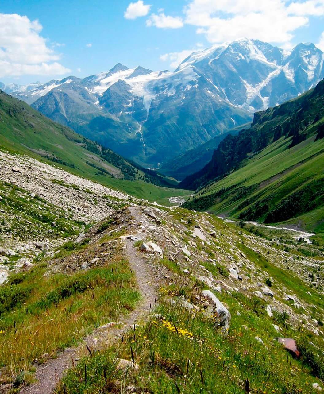 Самый крутой вертикальный километр в России! Трасса Вертикального километра проходит от моста, ведущему к альплагерю «Безенги», по тропе к перевалу Столбовой. Старт на высоте 2000 метров, финиш на высоте 3000 метров. Маршрут проходит по скально-осыпной тропе.