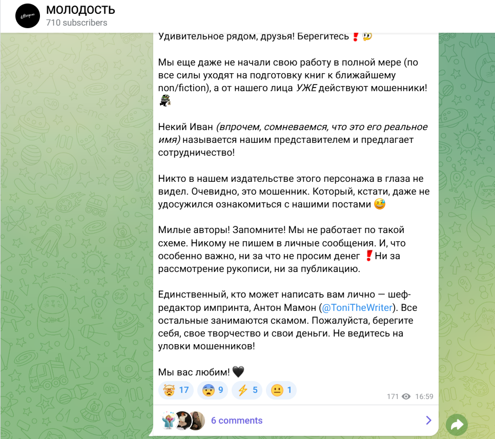 Сегодня в тг канале Молодость шеф-редактор Антон Мамон выложил пост (ниже скрины).
