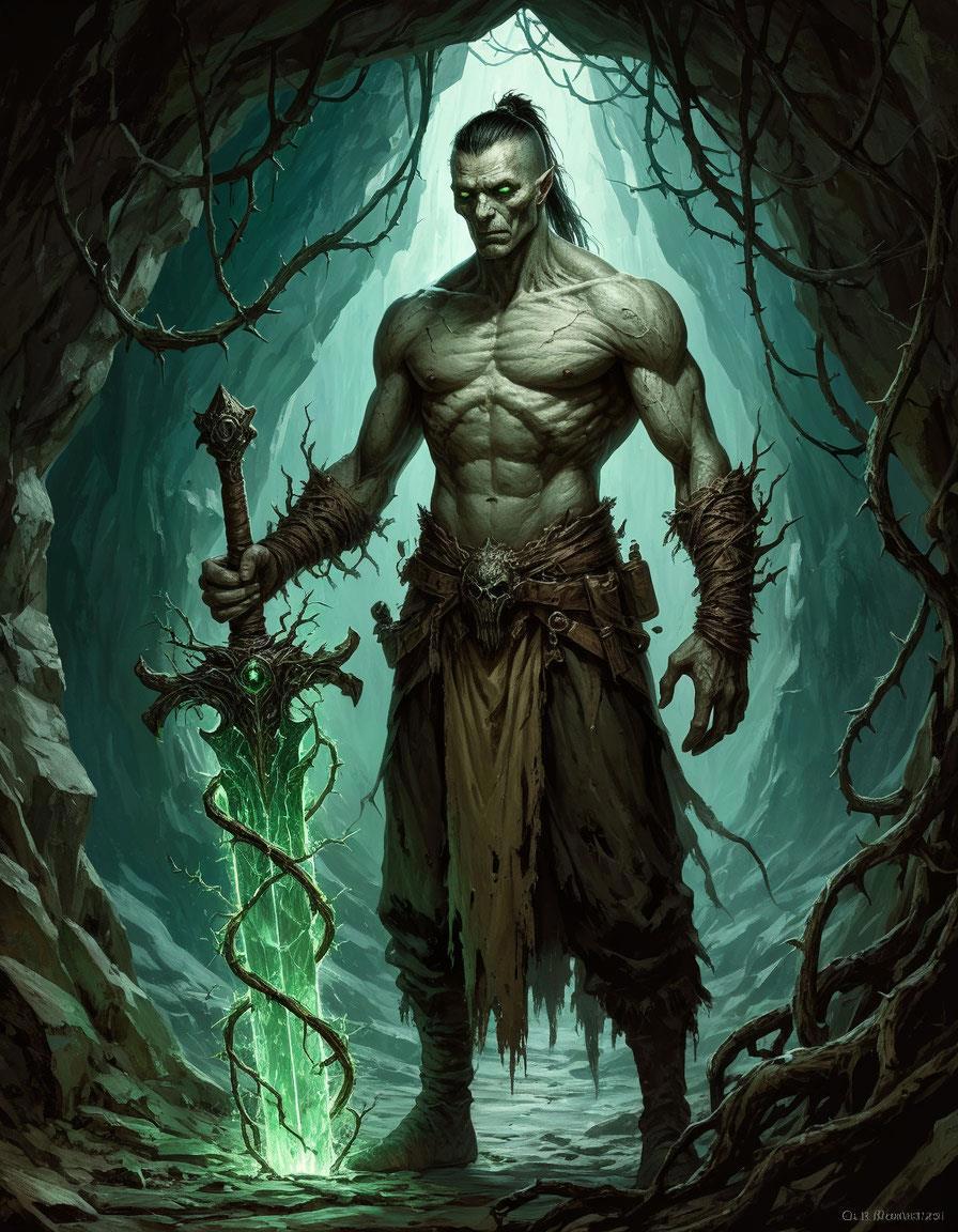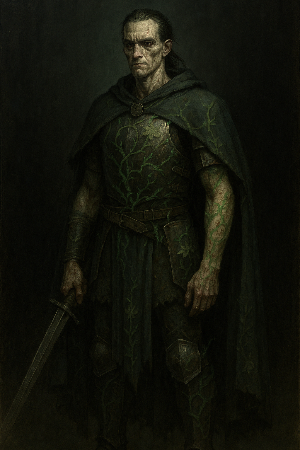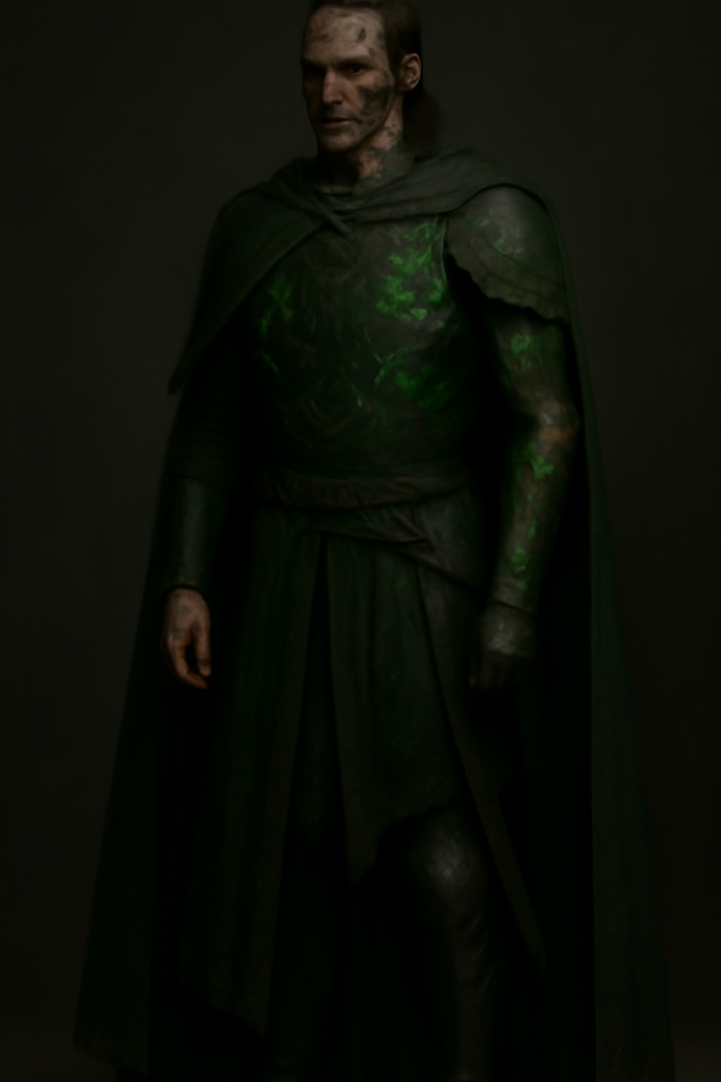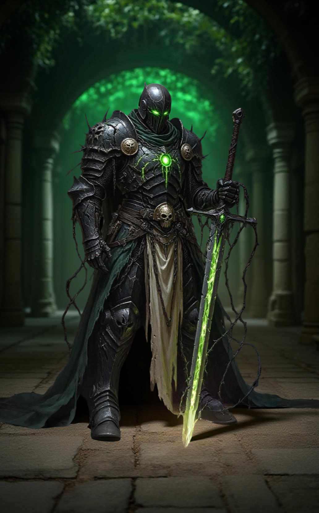 Для тех, кто с книгой не знаком, ГГ — это двухметровая мумифицированная шпала, напоминающая внешне нежить. Его глаза горят грязно-зеленым огнем с примесью желтого. В своем логове он носит зеленую робу из грубой материи. Вне храма он одевает поверх робы — черную броню. Все это украшено терновой символикой и/или колючей проволокой — на выбор, как говорится.
