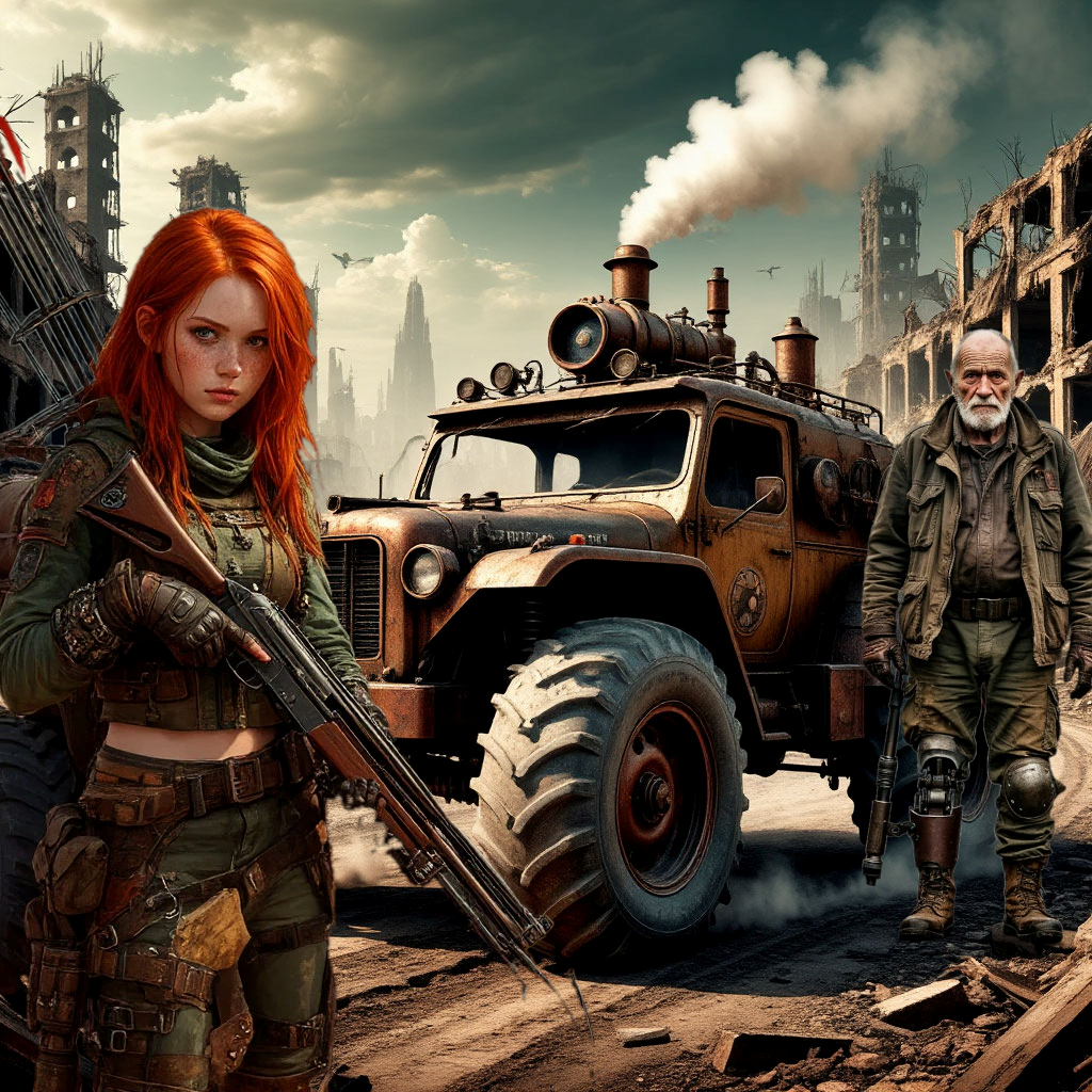 А это - новая. Тут жене, конечно, пришлось помучиться, чтобы совместить двух персонажей и вездеход. Но получилось очень круто. Дед Трофим тут именно такой, каким я его представлял. И Лисица, пожалуй, на себя больше похожа.