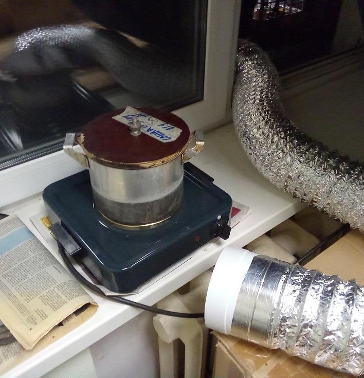 Однако время поджимало, и размягченная на водяной бане смола была доведена до жидкого состояния уже просто-напросто на плитке. Правда, на подоконнике при раскрытом окошке да еще и с самодельной вытяжкой, дабы уберечь от шока взыскательные носы обитателей здания: