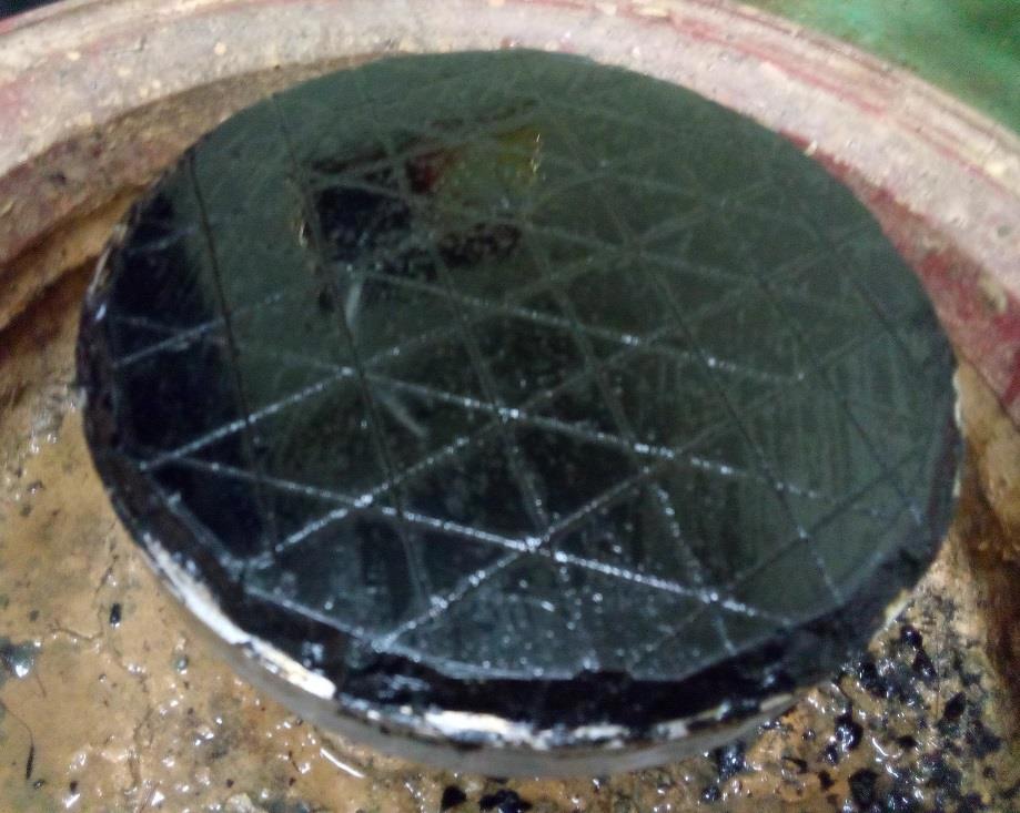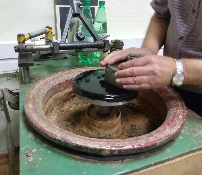 Как разровняли -- дождаться остывания, обколоть края ножом, ударяя по нему молотком, удалить смоляные "сопли" и процарапать канавки, по которым будет гулять полирующая суспензия. При полировке вручную канавки должны быть глубокими, до самого основания полировальника (а сделать их -- еще одна морока), но при полировке на станке достаточно просто процарапать канавки углом лезвия безопасной бритвы или ножом для линолеума.