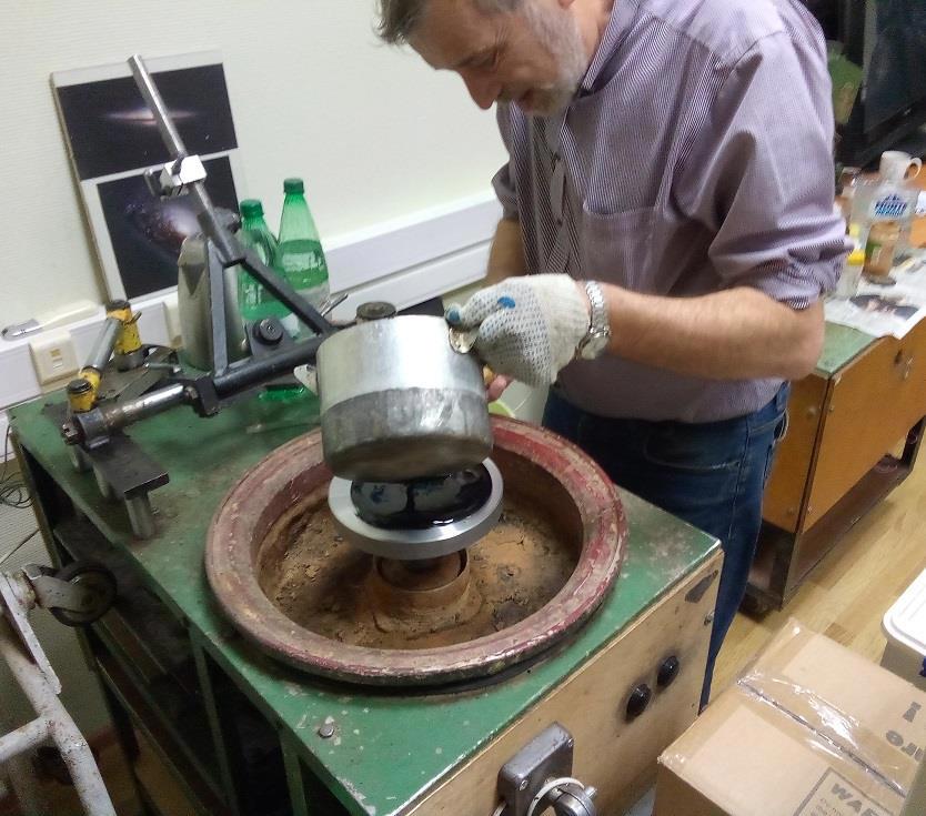 Ставим на шлифовально-полировальный станочек (кстати, самодельный, хотя у нас есть и "фирменные") подогретое основание будущего полировальника -- шлифовальник с примерно таким же радиусом кривизны, как у зеркала. Можно поставить и тот шлифовальник, на котором велась шлифовка, но тогда возникнет морока, если вдруг придется вернуться с полировки на тонкую шлифовку, что случается не так уж редко. Наш самодельный станочек, на котором можно полировать зеркала до 250 мм (сам делал, знаю), нравится мне тем, что у него 2 двигателя, а значит, можно менять соотношение между скоростью вращения шпинделя и частотой движения поводка в очень широких пределах.