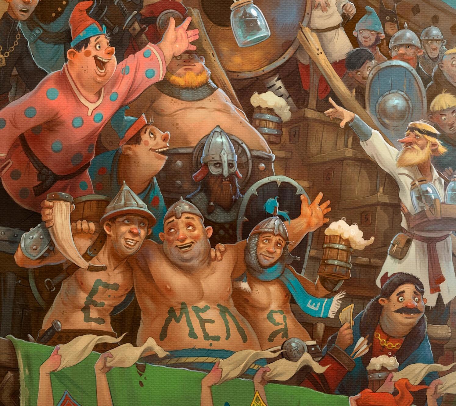 А еще это, наверное, получилась самая масштабная многофигурка, которую доводилось рисовать. По подсчетам на арте уместилось порядка 55 персонажей!